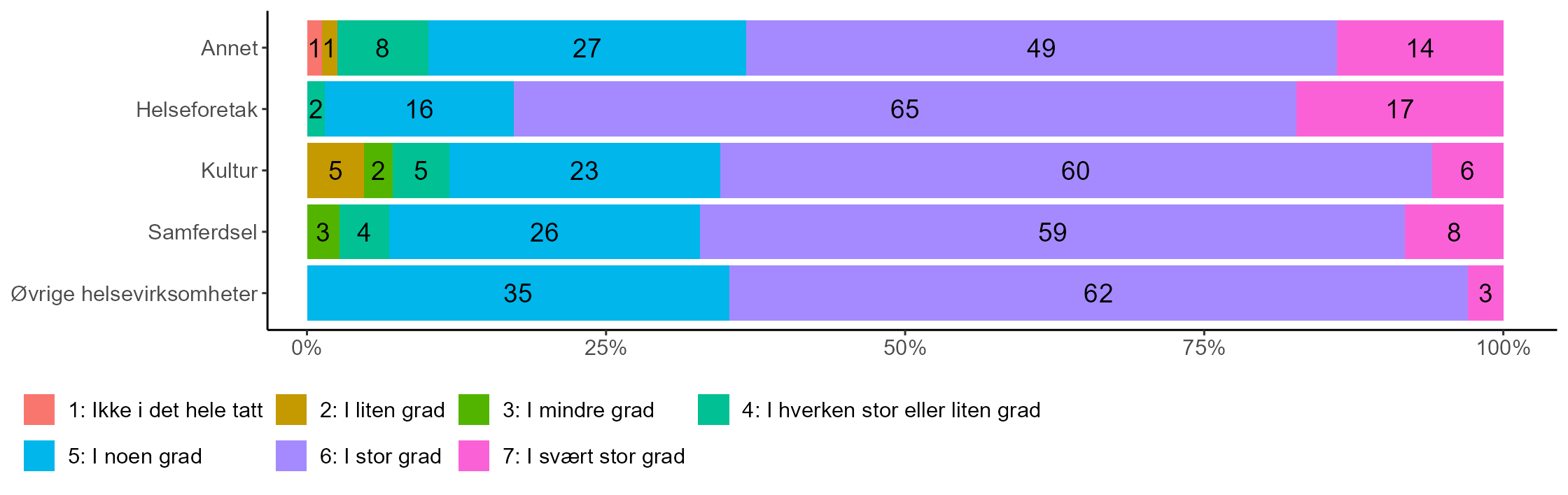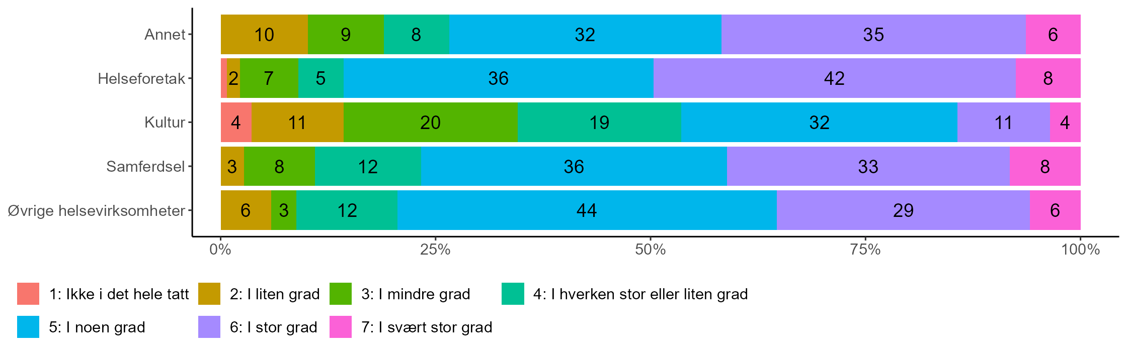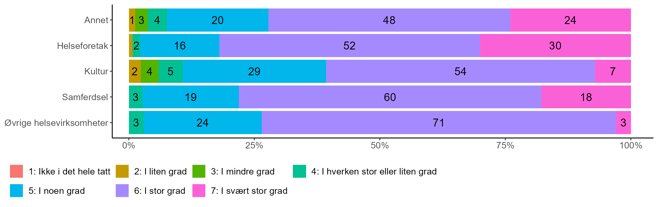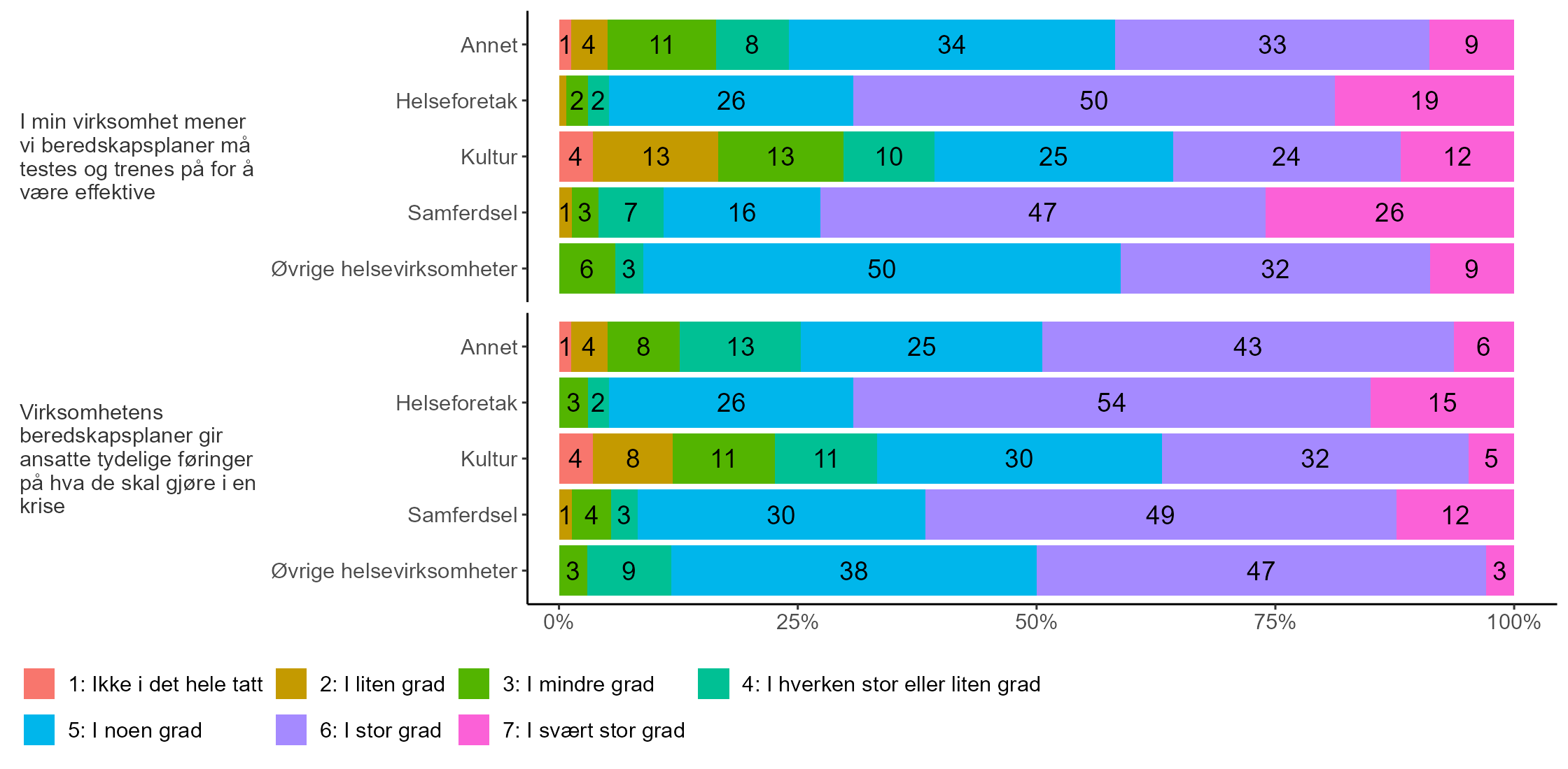 Hele 82 prosent av topplederne for helseforetakene uttrykker at de i stor eller svært stor grad er enige i at virksomheten anser seg for å være i stand til å skifte raskt bra business-as-usual til å reagere på kriser. Tilsvarende andel blant topplederne for samferdsel er 78 prosent, øvrige helsevirksomheter 74 prosent, og “annet” 72 prosent. Igjen er det en lavere andel toppledere i kultursektoren som anser seg for å kunne raskt reagere på kriser, selv om det også blant dem er en betydelig andel på 61 prosent som gir uttrykk for dette.