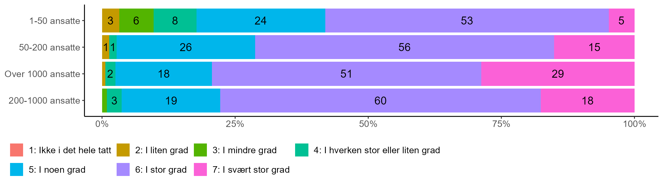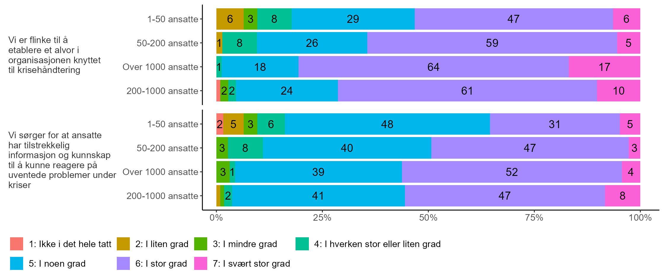 Tendensen er ikke like tydelig når det gjelder hvorvidt topplederne mener at de sørger for at ansatte har tilstrekkelig informasjon og kunnskap til å kunne reagere på uventede problemer under kriser. Mens 56 prosent av topplederne i de største virksomhetene hevder at dette i stor eller svært stor grad er tilfelle, er tilsvarende andel blant topplederne i de nest største virksomhetene omtrent like stor (55 prosent), og det er faktisk en høyere andel blant disse som uttrykker at dette i svært stor grad er tilfelle. Videre uttrykker halvparten (50 prosent) av topplederne for virksomheter med mellom 50 og 200 ansatte at de i stor eller svært stor grad sørger for at ansatte har tilstrekkelig informasjon og kunnskap til å kunne reagere på uventede problemer under kriser. Det er imidlertid kun 36 prosent av topplederne for de minste virksomhetene som hevder dette, og blant disse oppgir ti prosent at det ikke i det hele tatt, i liten eller mindre grad er tilfelle.