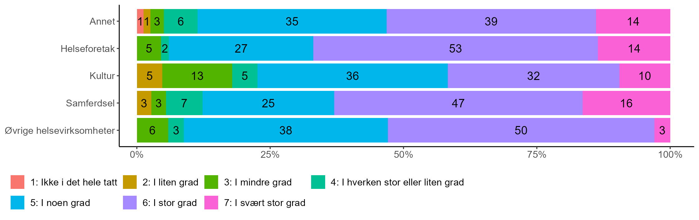Figur 2 viser at det er størst andeler som oppgir at de i stor eller svært stor grad har stor oppmerksomhet på hvordan kriser kan påvirke virksomheten blant toppledere for helseforetakene (66 prosent) og innen samferdsel (63 prosent). Innen de øvrige helsevirksomhetene og “annet” er andelen 53 prosent. Det er lavest andel som gir uttrykk for dette blant topplederne innen kultursektoren (42 prosent). Blant disse svarer 23 prosent i de ikke, i liten eller mindre grad har oppmerksomheten rettet mot dette.