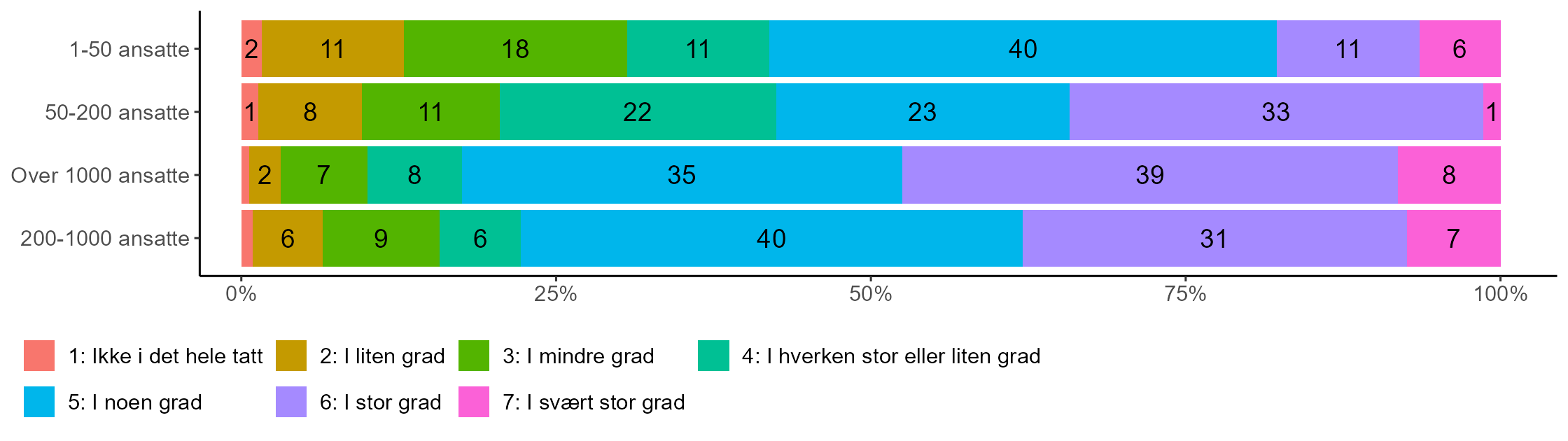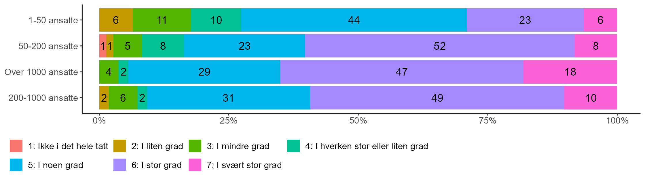 Nok en gang ser vi en økning i andelen som tilslutter seg påstandenetter virksomhetsstørrelse. Mens bortimot halvparten av topplederne for de største virksomhetene (48 prosent) hevder at virksomheten i stor eller svært stor grad jobber aktivt med å bygge relasjoner med organisasjoner som de kanskje må samarbeide med i en krise, er tilsvarende andel blant topplederne for de minste virksomhetene 17 prosent. For de to kategoriene mellom ligger andelene som gir uttrykk for dette på 34 og 38 prosent. Blant topplederne for de minste virksomhetene ser vi at hele 31 prosent oppgir at det motsatte er tilfelle, nemlig at de i ikke i det hele tatt, i liten eller i mindre grad driver kriseberedskap i form av aktiv relasjonsbygging.