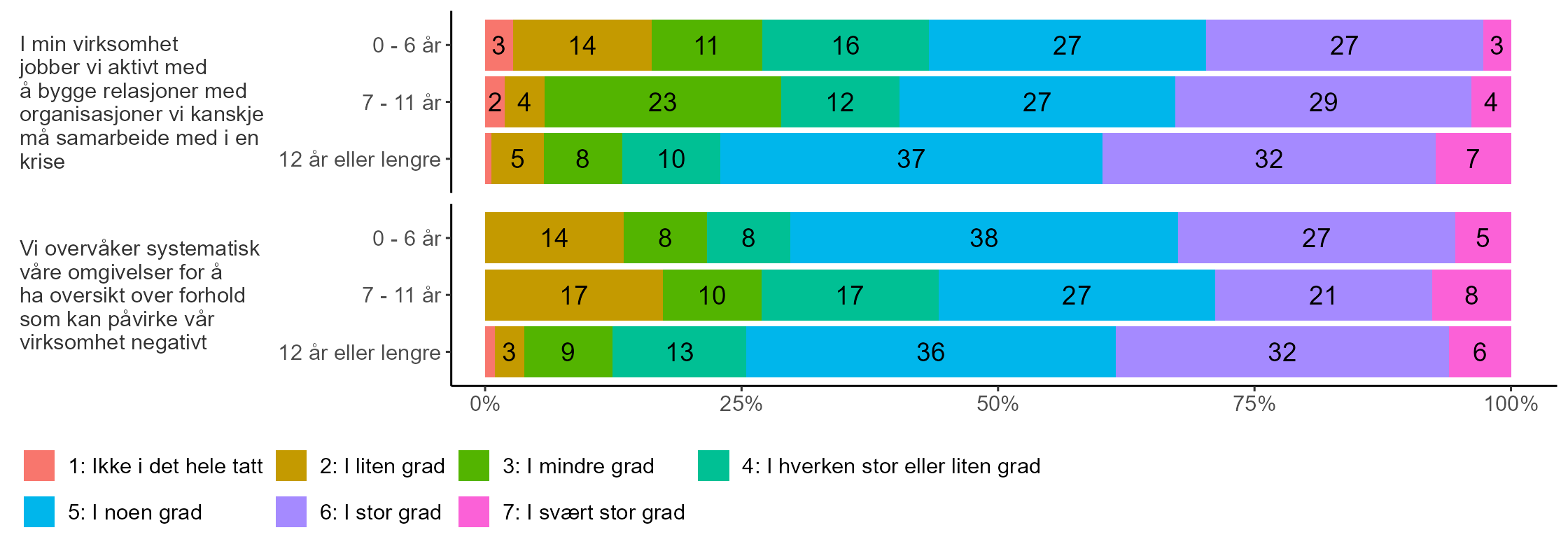 Figur 6 viser at topplederne med lengst erfaring i noe større grad rapporterer at de i stor eller svært stor grad både systematisk overvåker omgivelsene for å ha oversikt over hvilke forhold som kan påvirke virksomheten negativt (38 prosent) og at de jobber aktivt med å bygge relasjoner med organisasjoner de kanskje må samarbeide med i en krise (40 prosent), sammenliknet med topplederne med mindre erfaring. Derimot oppgir 27 prosent av topplederne med 7-10 års erfaring og 22 prosent av lederne med minst erfaring at de ikke, i liten eller mindre grad systematisk overvåker omgivelsene. Videre oppgir 29 prosent av topplederne med 7-10 års erfaring og 28 prosent av topplederne med minst erfaring at de ikke, i liten eller mindre grad aktivt bygger relasjoner til andre organisasjoner.