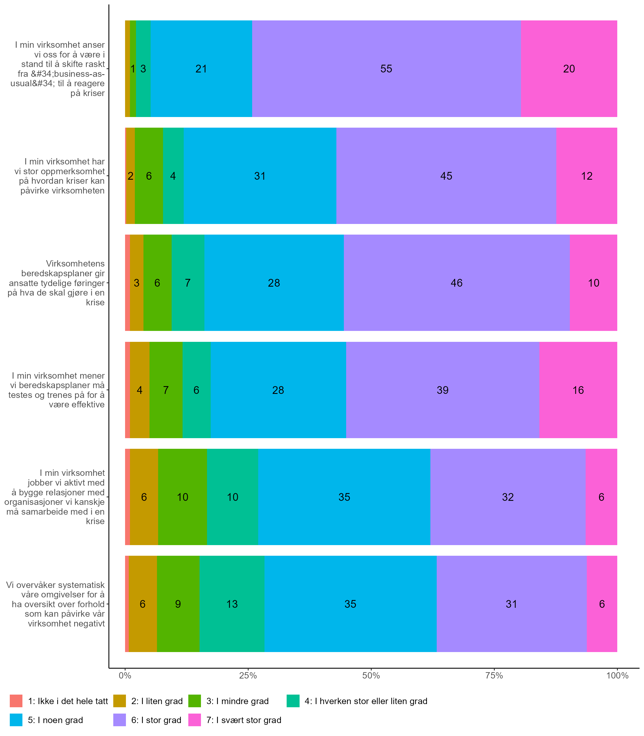 Tre av fire toppledere (75 prosent) oppgir de anser virksomheten som i stor eller svært stor grad å være i stand til å skifte raskt fra business-as-usual til å reagere på kriser. Over halvparten (57 prosent) uttrykker også at de mener at de i stor eller svært stor grad har mye oppmerksomhet på hvordan kriser kan påvirke virksomheten. Når det gjelder beredskapsplaner svarer 55 prosent at de i stor eller svært stor grad mener at slike planer må testes og trenes på for å være effektive, og omtrent like mange (56 prosent) at disse i stor eller svært stor grad gir ansatte tydelige føringer på hva de skal gjøre i en krise. Færre ser ut til å jobbe utadrettet, og 28 prosent oppgir at de ikke i det hele tatt, i liten eller mindre grad systematisk overvåker omgivelsene for å ha oversikt over forhold som kan påvirke virksomheten negativt. Tilsvarende gir om lag en like stor andel (26 prosent) at de ikke i det hele tatt, i liten eller mindre grad jobber aktivt med å bygge relasjoner med organisasjoner de kanskje må samarbeide med i en krise.