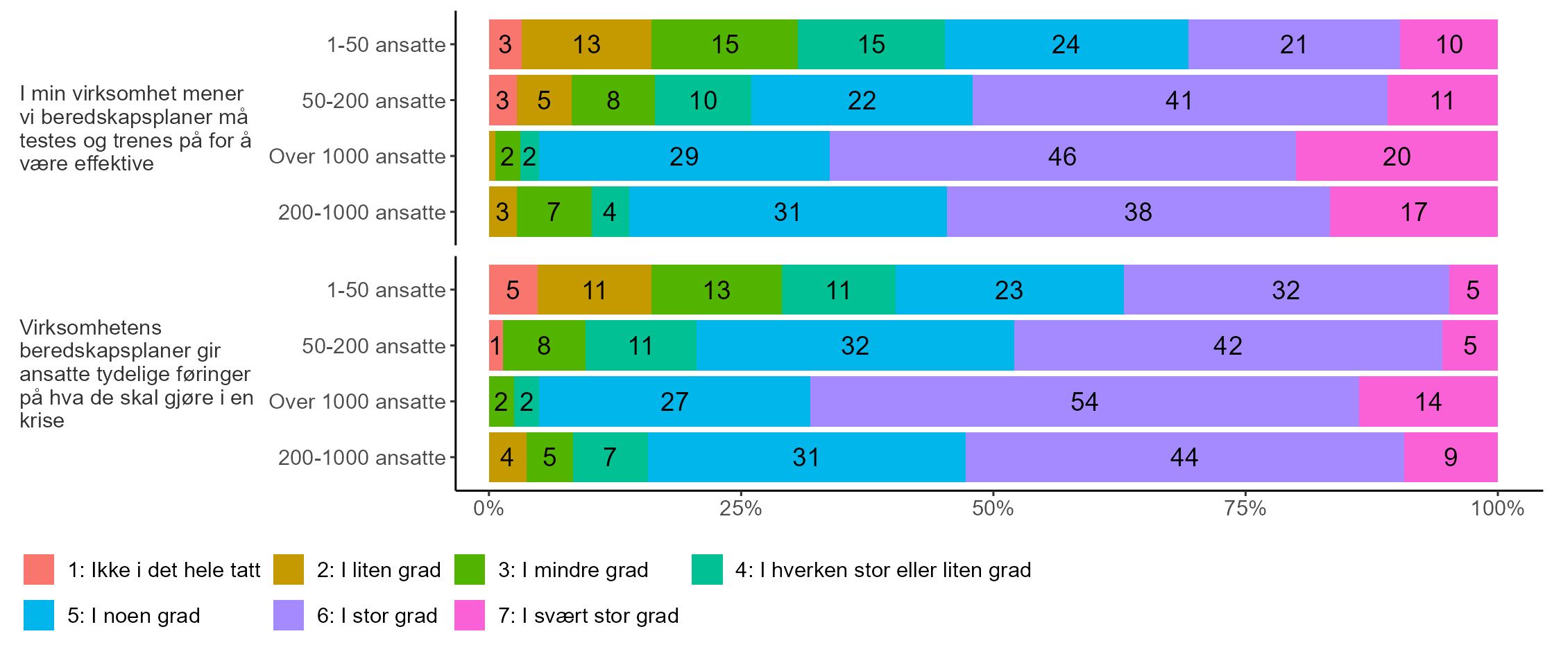 Mens hele 80 prosent av topplederne i de største virksomhetene og 78 prosent av topplederne med 200-1000 ansatte anser virksomhetene som i stor eller svært stor grad i stand til å skifte raskt fra business-as-usual til å reagere på kriser, er tilsvarende andel blant de minste virksomhetene 58 prosent.