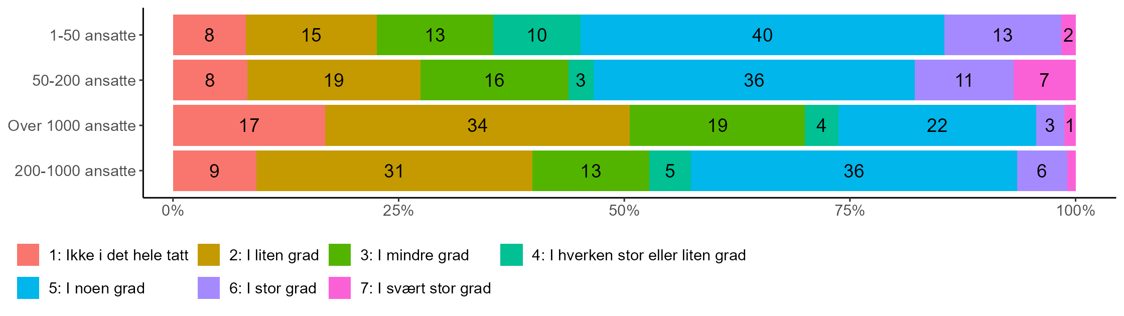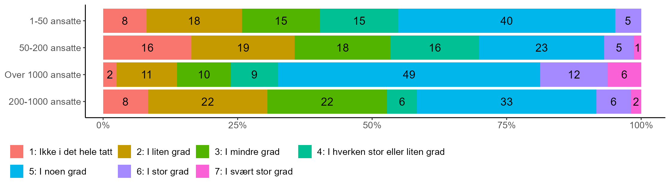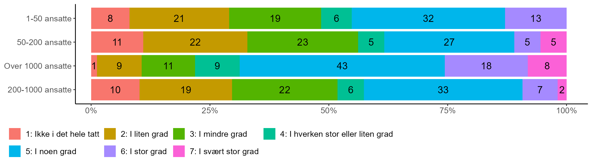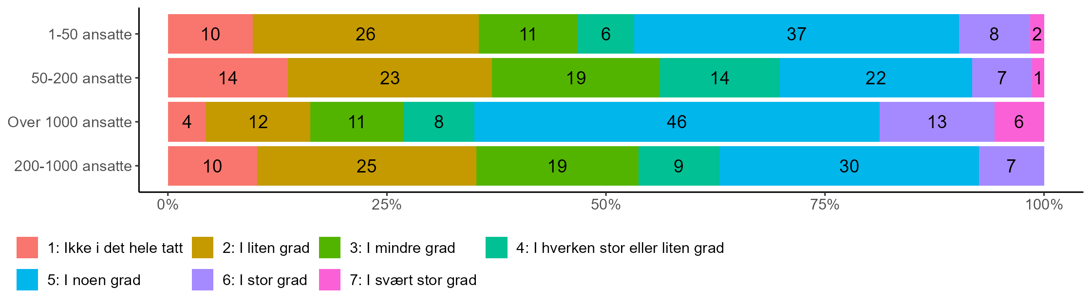 Mens 67 prosent av topplederne for virksomheter med over 1000 ansatte hevder at dette i noen, stor eller svært stor grad er tilfelle, er tilsvarende andel blant topplederne for virksomheter med mellom 50 og 200 ansatte 29 prosent, og 41 prosent blant topplederne for virksomheter med mellom 200 og 1000 ansatte. Andelen er noe høyere igjen for topplederne for de minste virksomhetene, hvor 45 prosent oppgir dette. I virksomhetene i mellomkategoriene svarer over halvparten at mangel på kompetanse ikke i det hele tatt, i liten grad eller i mindre grad har ført til at virksomheten har redusert aktiviteter (53 prosent i virksomheter med 50-200 ansatte og 52 prosent i virksomheter med 200-1000 ansatte).