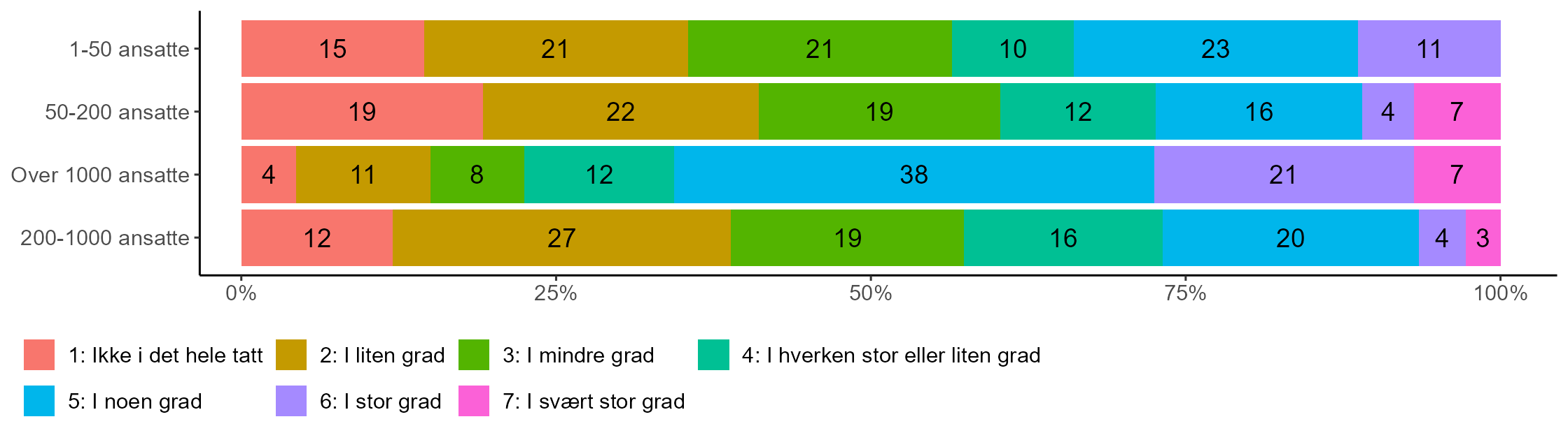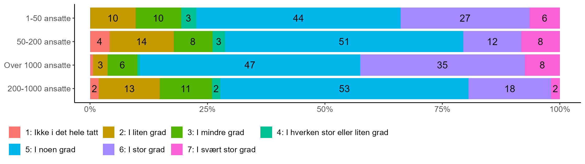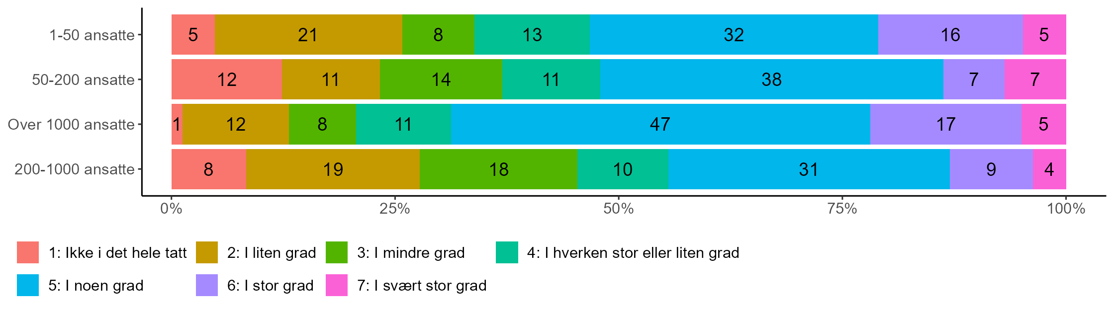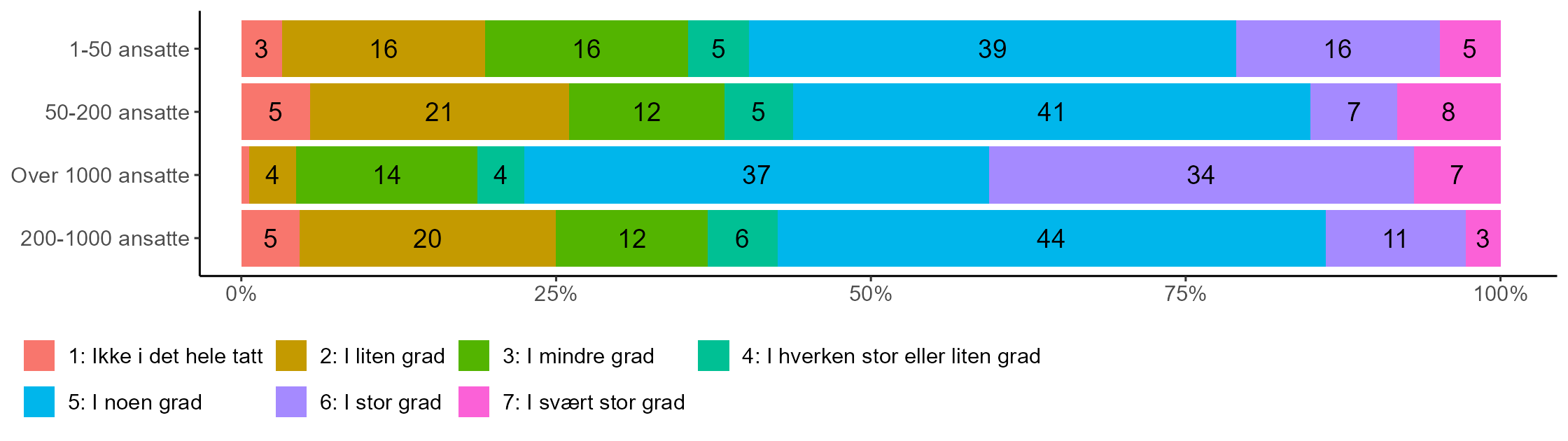 Mens 67 prosent av topplederne for virksomheter med over 1000 ansatte hevder at dette i noen, stor eller svært stor grad er tilfelle, er tilsvarende andel blant topplederne for virksomheter med mellom 50 og 200 ansatte 29 prosent, og 41 prosent blant topplederne for virksomheter med mellom 200 og 1000 ansatte. Andelen er noe høyere igjen for topplederne for de minste virksomhetene, hvor 45 prosent oppgir dette. I virksomhetene i mellomkategoriene svarer over halvparten at mangel på kompetanse ikke i det hele tatt, i liten grad eller i mindre grad har ført til at virksomheten har redusert aktiviteter (53 prosent i virksomheter med 50-200 ansatte og 52 prosent i virksomheter med 200-1000 ansatte).