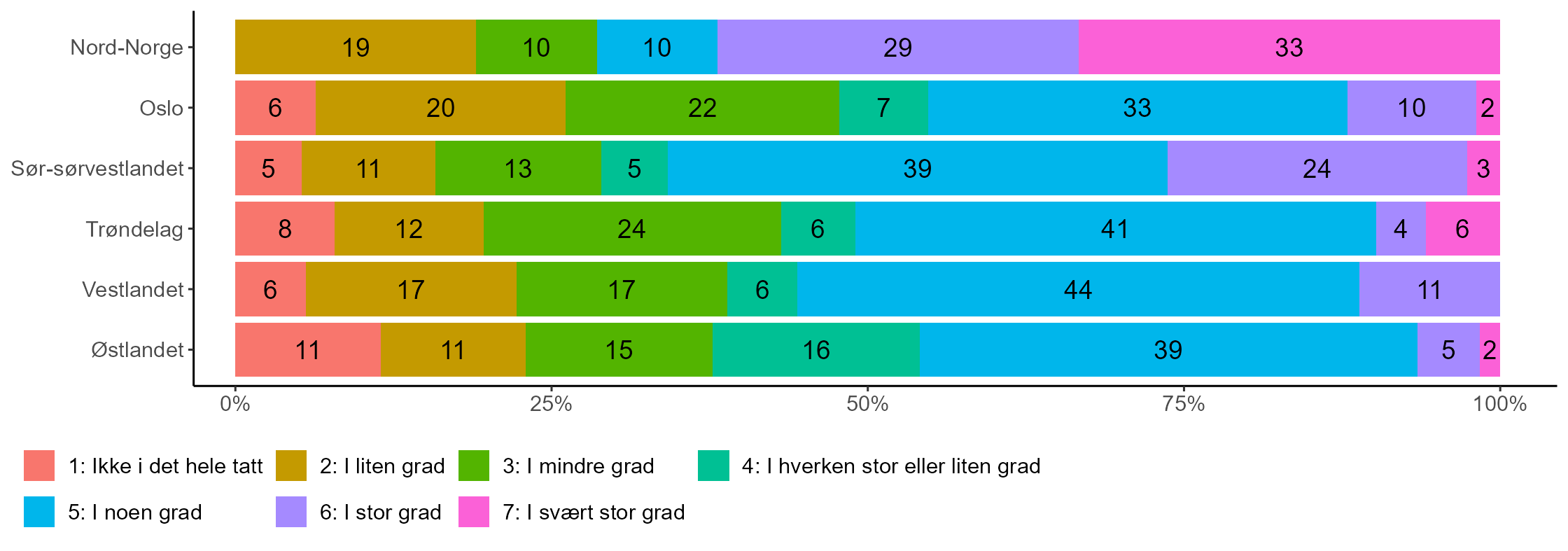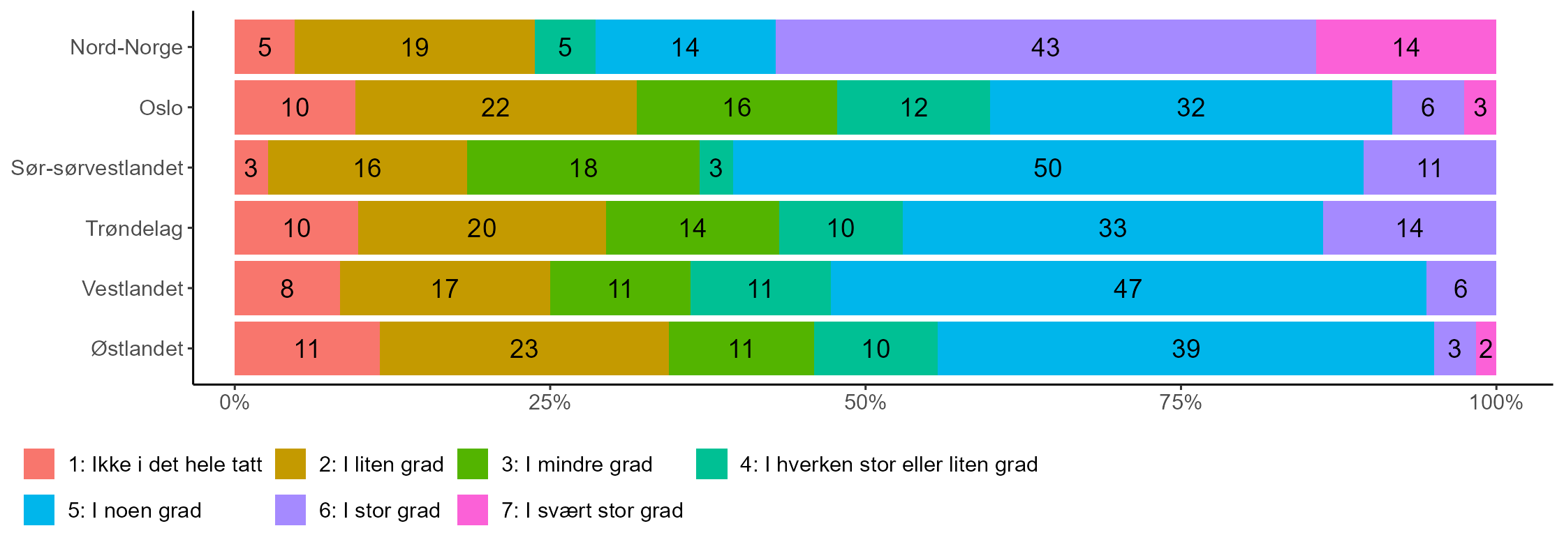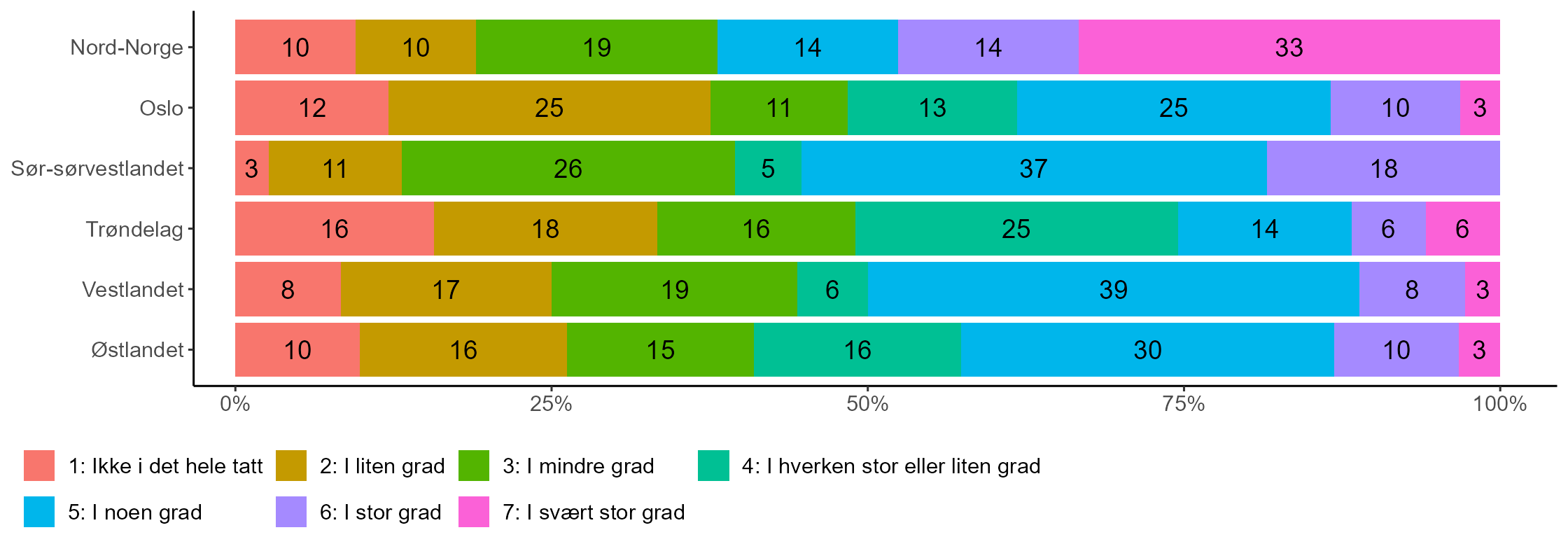 Videre finner vi signifikante forskjeller mellom landsdelene når det gjelder toppledernes vurdering av hvorvidt mangel på kompetanse har ført til at virksomheten ikke har klart å løse virksomhetens oppgaver på en tilfredsstillende måte (se figur 3):