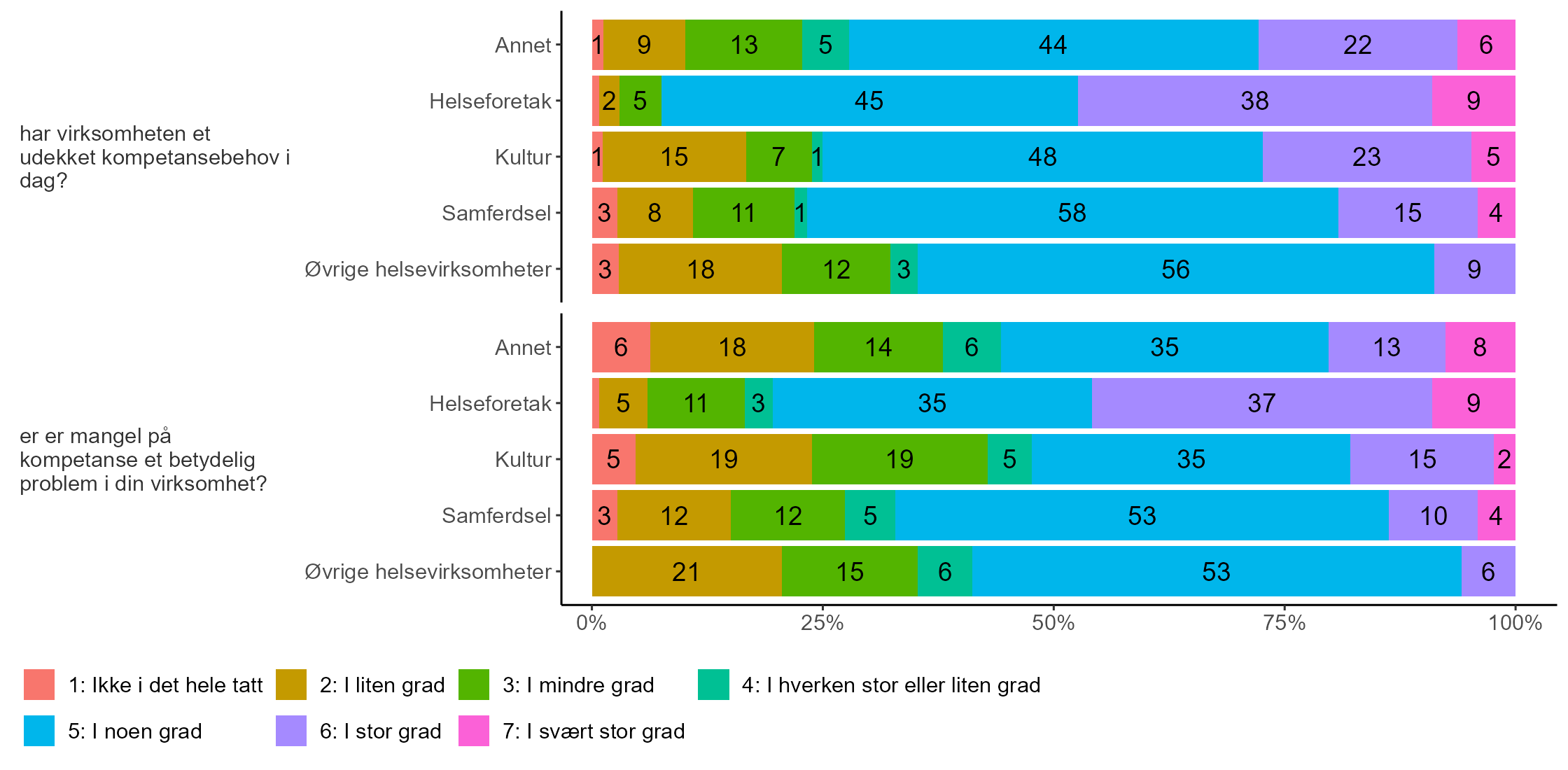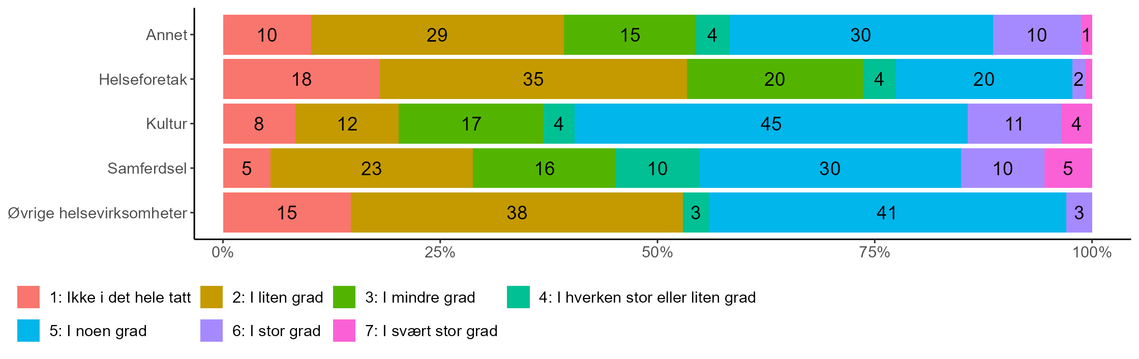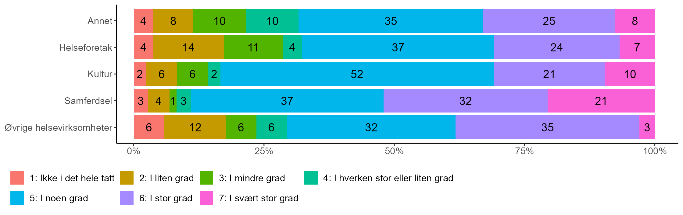 Det er høyest andel blant topplederne innenfor kultursektoren som uttrykker at innleieforbudet i stor eller svært stor grad vil utfordre virksomhetens mulighet til å få dekket behovet for kompetanse (46 prosent), etterfulgt av toppledere innen helseforetakene (39 prosent) og samferdsel (33 prosent). Det er en betydelig lavere andel som oppgir dette innen de øvrige helsevirksomhetene (18 prosent) og topplederne i kategorien «annet» (16 prosent). Det er høyest andel blant “annet” som uttrykker at de ikke i det hele tatt eller i liten grad anser at dette er tilfelle (34 prosent), etterfulgt av topplederne ved helseforetakene (27 prosent).