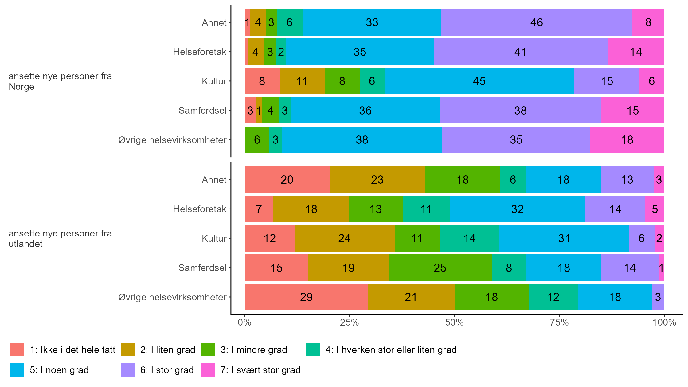 Når det gjelder å rekruttere nye ansatte fra utlandet, ser vi at det spesielt blant topplederne i øvrige helsevirksomheter er en høy andel som uttrykker at dette ikke i det hele tatt eller i liten grad er aktuelt (50 prosent) og i restkategorien «annet» (43 prosent). Det er høyest andel som anser dette som en i stor eller svært stor grad aktuell strategi innen helseforetakene (19 prosent) og samferdsel (15 prosent) og i øvrige sektorer (16 prosent). I kultursektoren er andelen åtte prosent, og i øvrige helsevirksomheter bare tre prosent.
