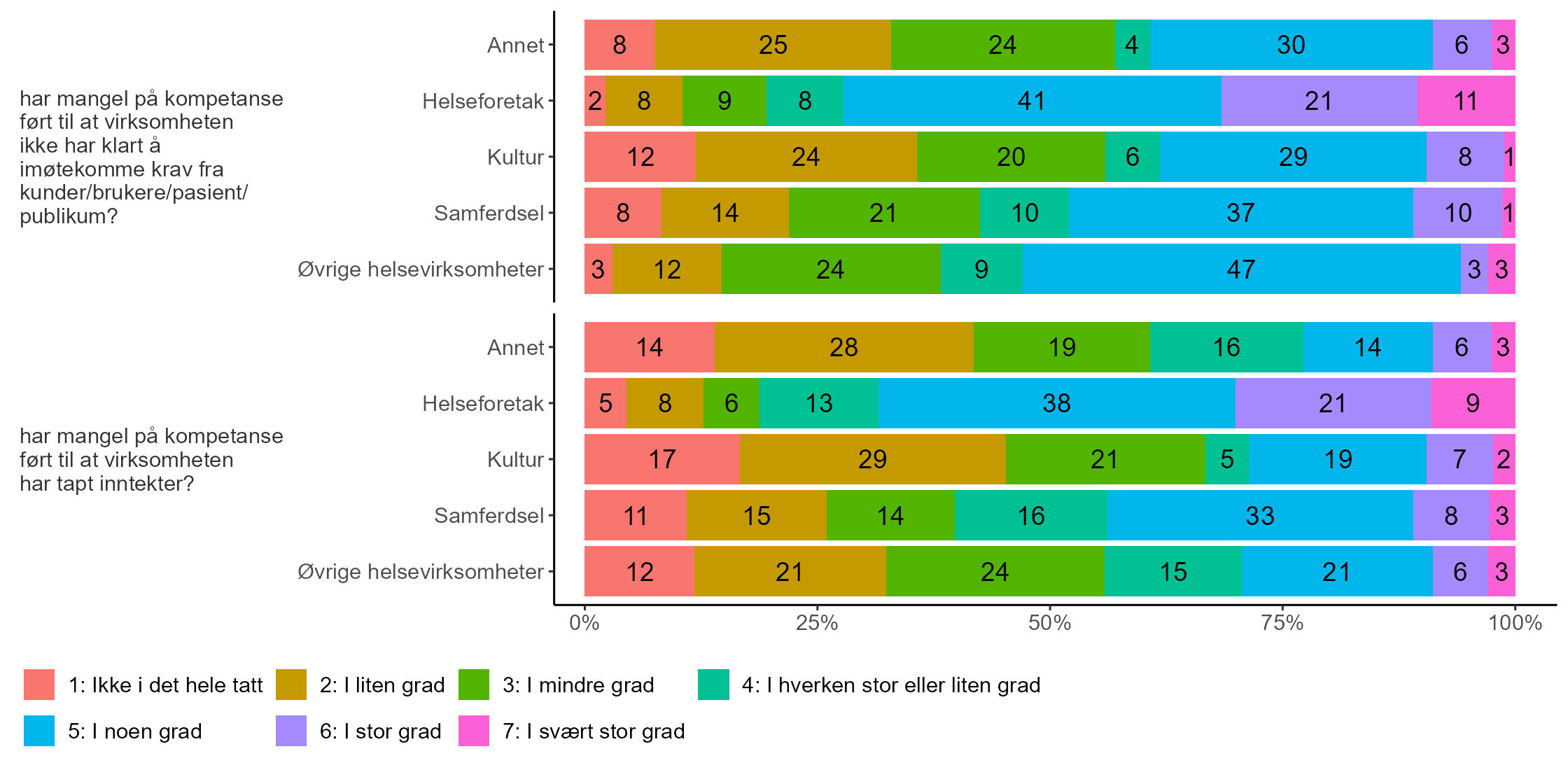 Igjen er det topplederne ved helseforetakene som skiller seg ut ved at rundt tre av ti både uttrykker at mangel på kompetanse i stor eller svært stor grad har ført til at virksomheten ikke har klart å imøtekomme krav fra brukere og pasienter (32 prosent) og til at virksomheten har tapt inntekter (30 prosent). Ser vi på de øvrige helsevirksomhetene hevder kun seks prosent at mangel på kompetanse i stor eller svært stor grad har ført til at virksomheten ikke har klart å imøtekomme krav fra brukere og pasienter, og ni prosent at virksomheten har tapt inntekter som følge av manglende kompetanse. Andelen blant topplederne innen samferdsel er 11 prosent på begge, og kultur og “annet” er ni prosent på begge.