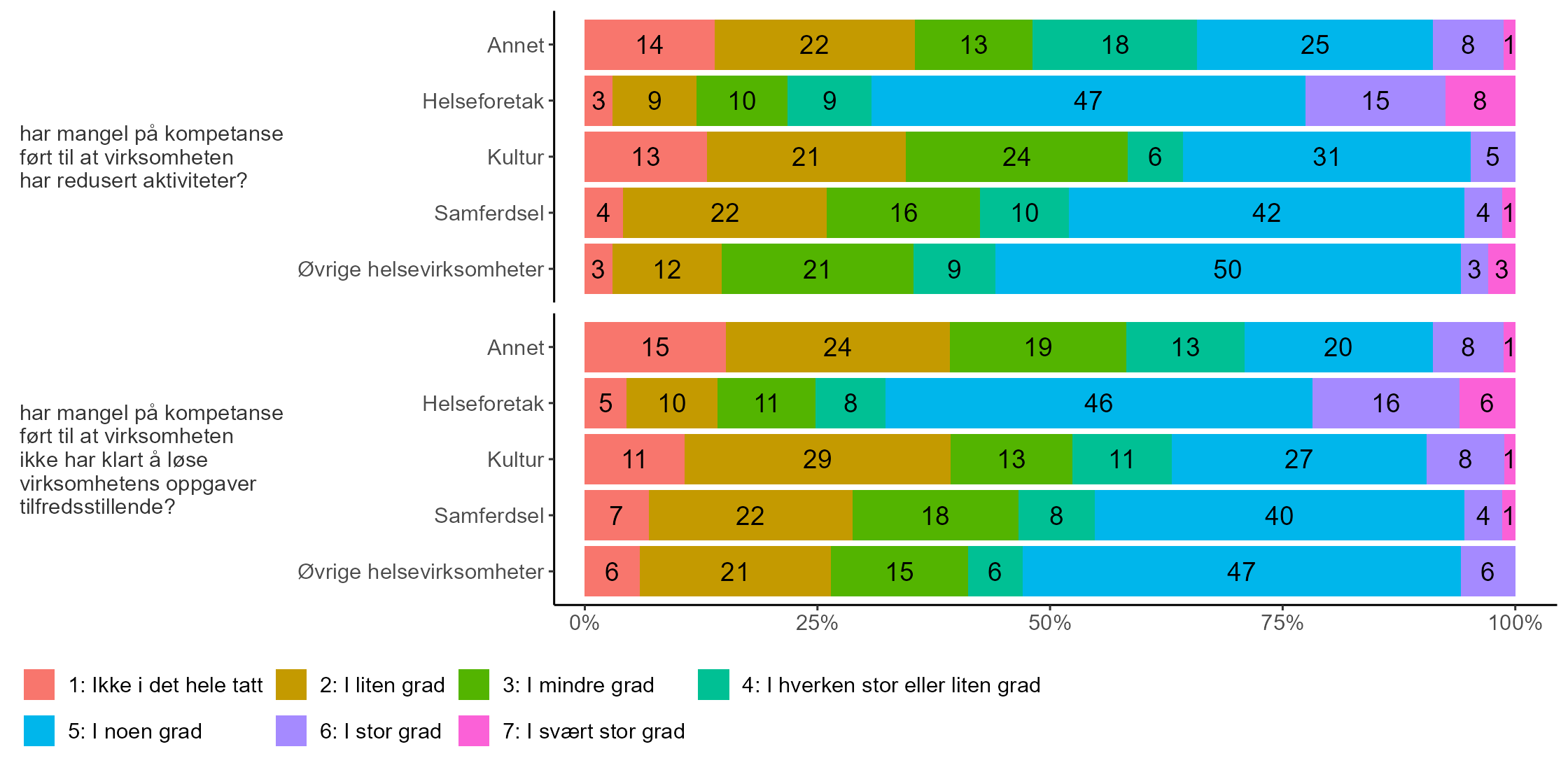 Vi ser videre at 23 prosent av topplederne i helseforetakene oppgir at mangel på kompetanse i stor eller svært stor grad har ført til at virksomheten har redusert aktivitetene. Tilsvarende andel blant toppledere i øvrige helsevirksomheter er seks prosent, mens den er fem prosent blant topplederne både innen samferdsel og innen kultursektoren og ni prosent i “annet”. I kategorien “annet” (36 prosent) og i kultursektoren (34 prosent) rapporteres det at mangel på kompetanse ikke i det hele tatt eller i liten grad har ført til redusert aktivitet.