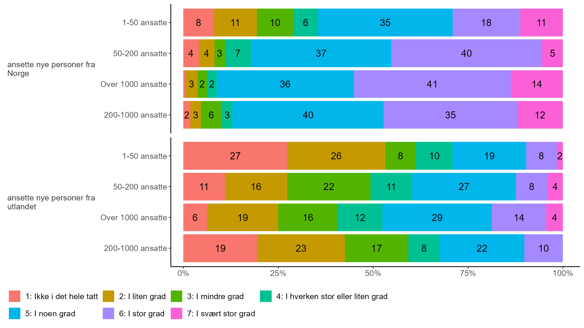 Bildet er mer sammensatt når det gjelder det vurderingen av hvor aktuelt det er å ansette nye personer fra utlandet. Litt i overkant av halvparten (53 prosent) av topplederne for de minste virksomhetene svarer at dette ikke i det hele tatt eller i liten grad er en aktuell strategi for deres vedkommende for å dekke kompetansebehovet. Det samme uttrykker 42 prosent av topplederne for virksomheter med mellom 200 og 1000 ansatte. På motsatt ende av svarskalaen er det 19 prosent av topplederne ved de største virksomhetene som hevder at rekruttering av nye personer i utlandet i stor eller svært stor grad er aktuelt. Det er omtrent én av ti (10-12 prosent) som uttrykker dette blant topplederne i de øvrige virksomhetene.