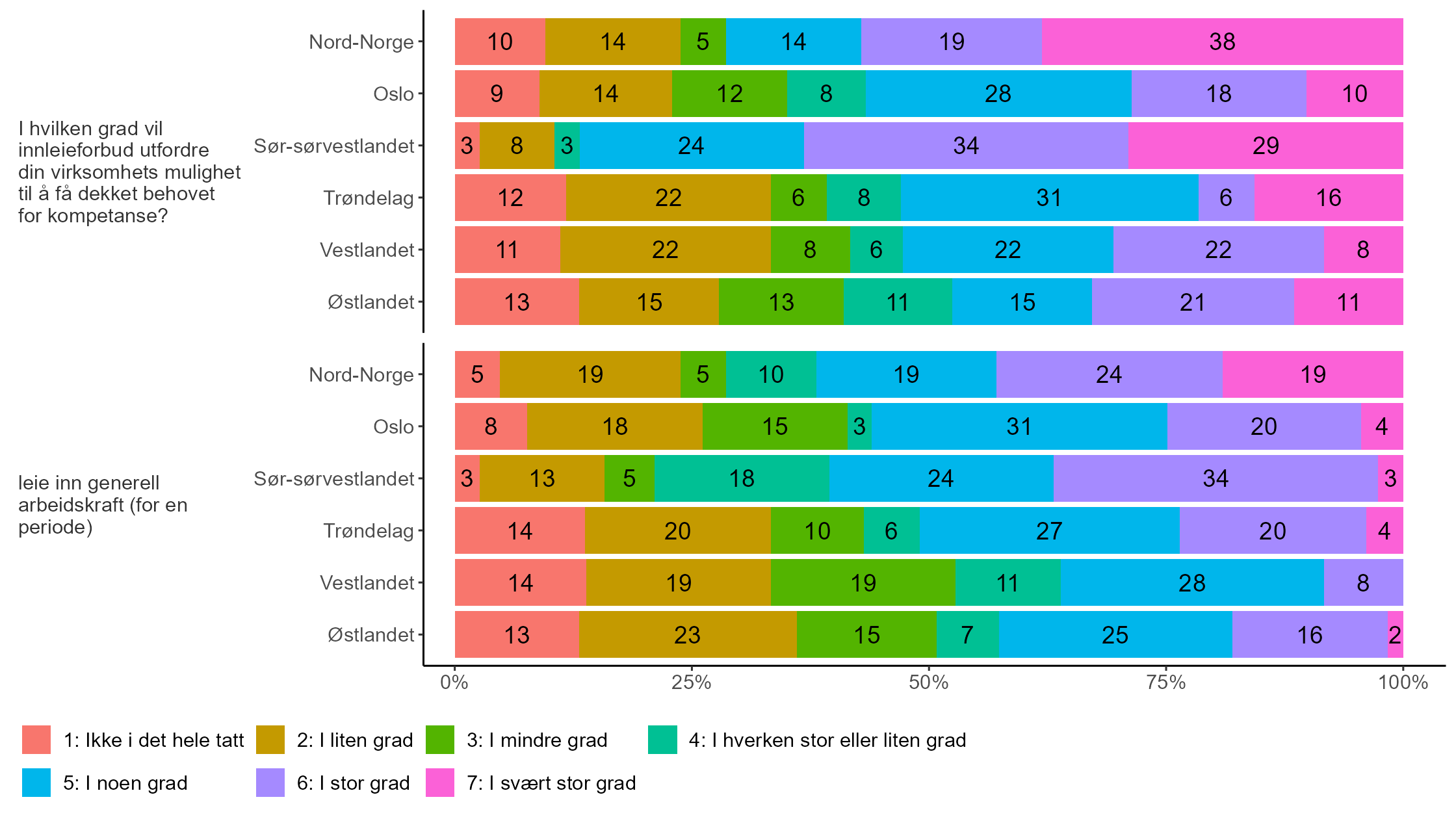 Vi ser for det første at en betydelig høyere andel toppledere i Sør-Sørvestlandet (63 prosent) og Nord-Norge (50 prosent) mener at innleieforbudet i stor eller svært stor grad vil utfordre virksomhetens mulighet for å få dekket behovet for kompetanse. Til sammenlikning hevder kun 22 prosent av topplederne i Trøndelag dette, og i underkant av tre av ti på både Østlandet (29 prosent) og i Oslo (28 prosent). Blant topplederne på Vestlandet uttrykker like store andeler (33 prosent) at dette i stor eller svært stor grad er tilfelle på den ene siden, og at det ikke i det hele tatt eller i liten grad er det.