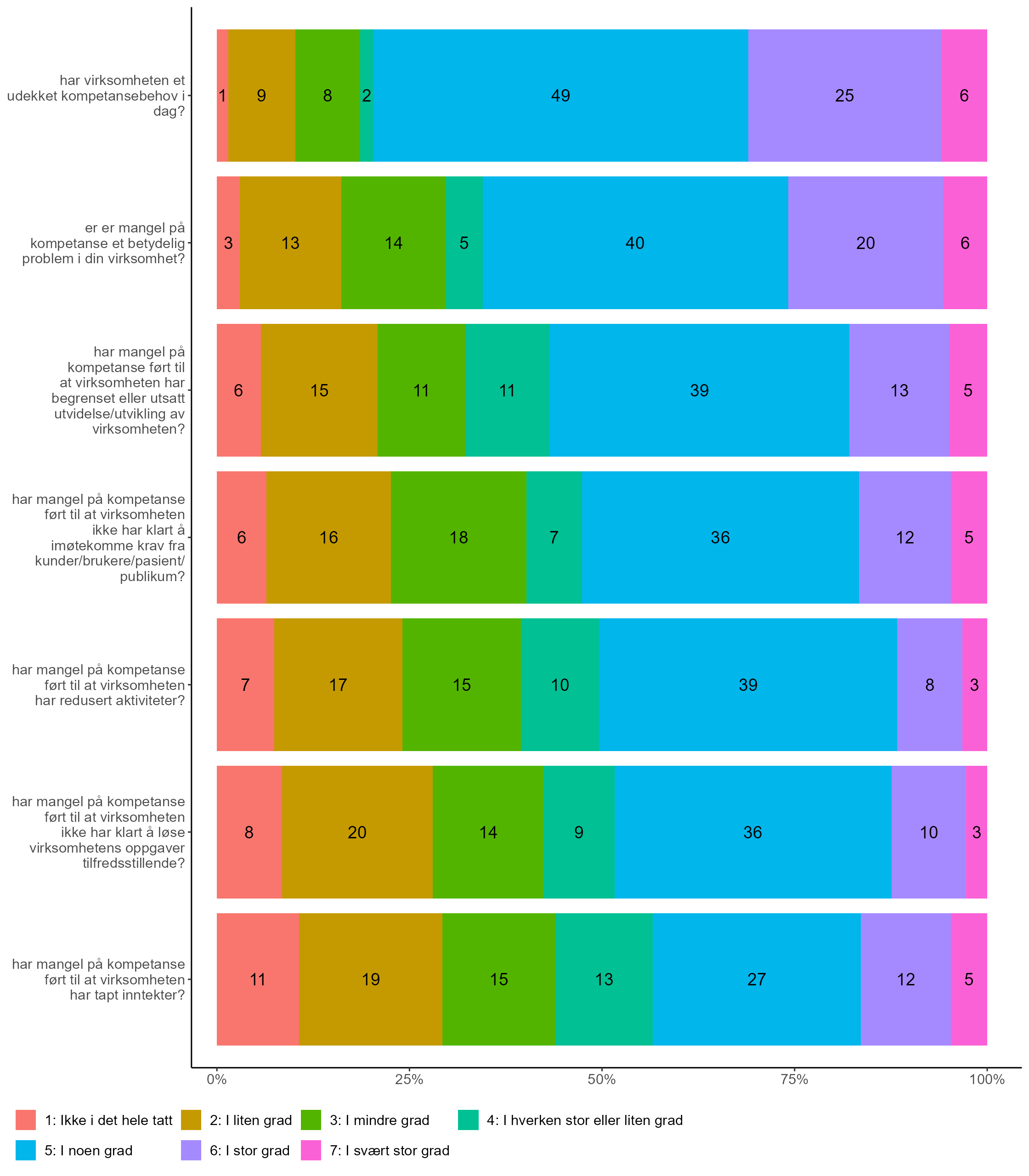 Videre viser figur 1 at 13 prosent oppgir at mangel på kompetanse i stor eller svært stor grad har ført til at virksomheten ikke har klart å løse virksomhetens oppgaver tilfredsstillende, og 12 prosent at det har ført til at virksomheten har redusert aktivitetene. Også her er det verdt å merke seg at slår vi sammen kategoriene “i noen grad”, “i stor grad” og “i svært stor grad”, så har kompetansemangelen medført redusert aktivitet hos 51 prosent av topplederne.