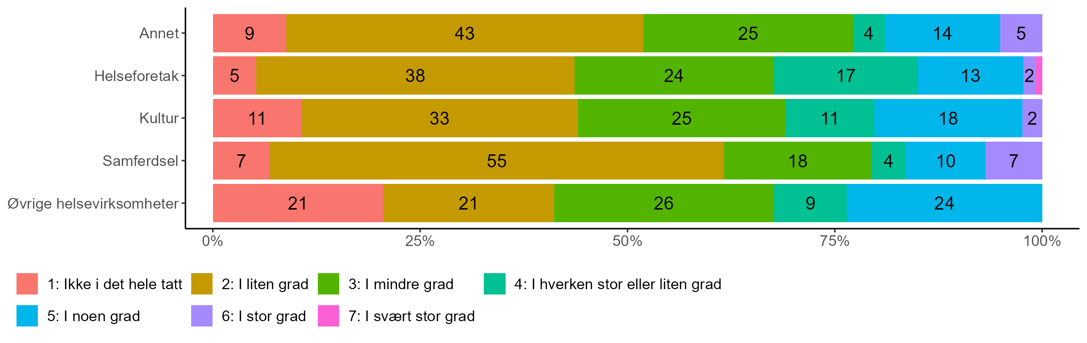 Dette utsagnet er det generelt sett færre som gir uttrykk for at stemmer i stor eller svært stor grad, men vi ser at andelen er høyest innen samferdsel (24 prosent) og i øvrige helsevirksomheter (21 prosent). Kun to prosent av topplederne innen kultursektoren oppgir at dette i stor grad er tilfelle, og ingen at det i svært stor grad er det. På den andre siden svarer 27 prosent av disse topplederne at de ikke i det hele tatt eller i liten grad kjenner seg igjen i at de vektlegger effektivitet framfor nyskaping. Blant topplederne av helseforetakene oppgir 13 prosent at de i stor eller svært stor grad vektlegger effektivitet framfor nyskaping, og 17 prosent av topplederne i restkategorien gjør det samme.