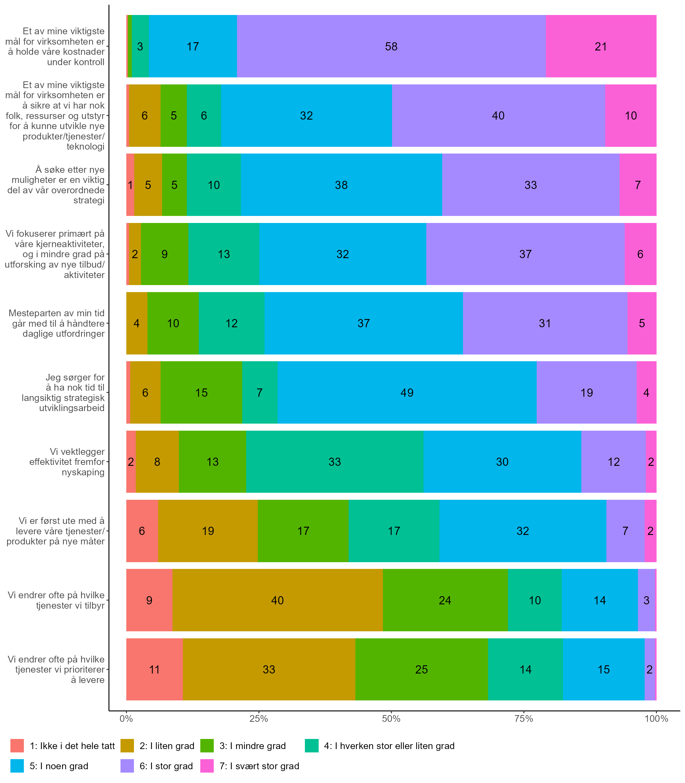 Videre svarer 40 prosent at det i stor eller svært stor grad stemmer at det å søke etter nye muligheter er en viktig del av virksomhetens overordnete strategi. På den andre siden uttrykker omtrent like mange (43 prosent) at det i stor eller svært stor grad stemmer at virksomheten primært fokuserer på kjerneaktiviteten, og i mindre grad på utforsking av nye tilbud eller aktiviteter.