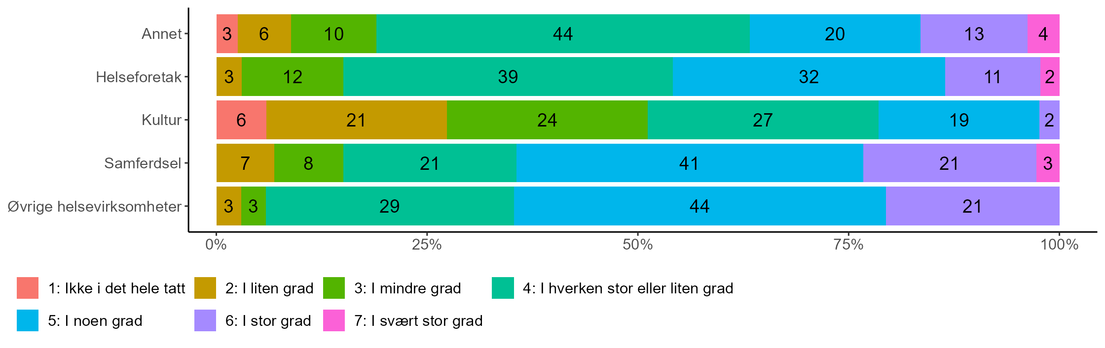 Det er høyest andel som tilslutter seg dette utsagnet blant topplederne i kultursektoren, hvor halvparten (50 prosent) oppgir at det i stor eller svært stor grad stemmer at mesteparten av deres tid går med til å håndtere daglige utfordringer. Nest høyest andel finner vi blant topplederne i helseforetakene (41 prosent). Det er lavere andeler innen samferdsel (28 prosent), øvrige helsevirksomheter og “annet” (27 prosent) som tilkjennegir dette. Vi ser noe av det samme mønsteret når det gjelder utsagnet om at et av de viktigste målene for virksomheten er å sikre tilstrekkelig med folk, ressurser og utstyr for å kunne utvikle nye produkter eller tjenester, eller ny teknologi. Dette er illustrert i figur 7:
