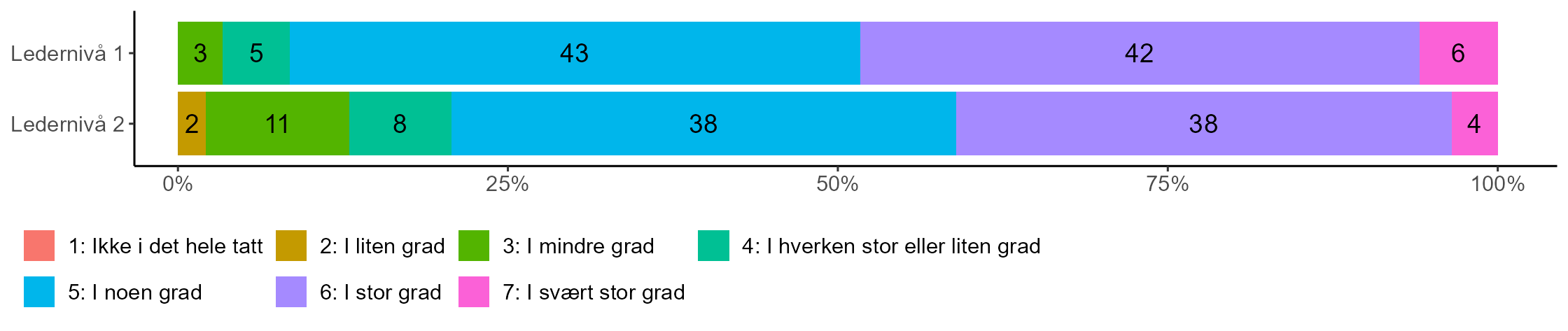 Det er høyest andel blant lederne på øverste nivå som gir uttrykk for at toppledelsen i stor eller svært stor grad foretar grundige vurderinger av flere årsaker til problemer (49 prosent), sammenliknet med lederne på nivået under (42 prosent). Blant lederne på nivå 2 svarer 13 prosent at dette i liten eller mindre grad er tilfelle.