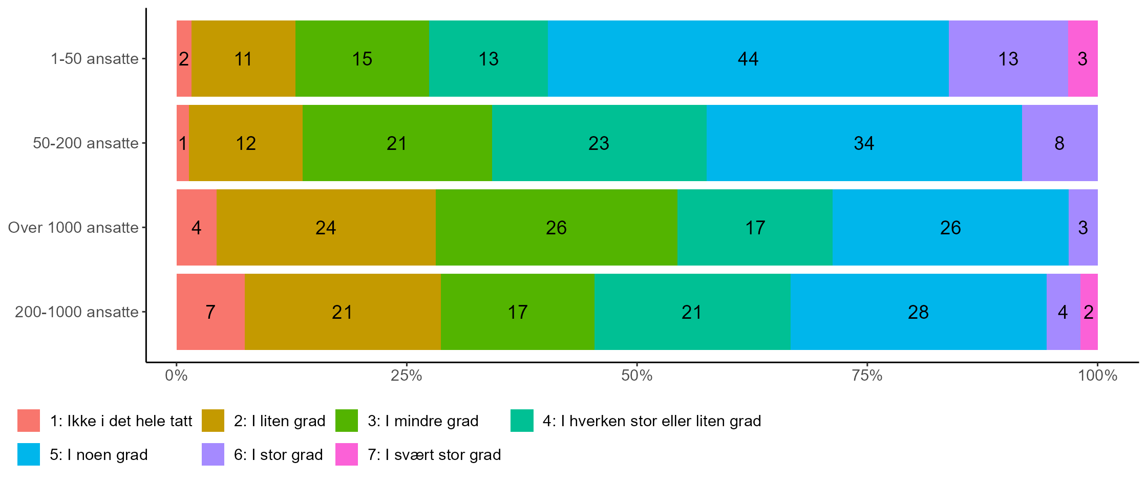 Figur 5 viser at 79 prosent svarer at et av deres viktigste mål for virksomheten er å i stor eller svært stor grad holde kostnadene under kontroll. Halvparten av topplederne (50 prosent) svarer at de i stor eller svært stor grad mener at et av deres viktigste mål for virksomheten er å sikre at de har nok folk, ressurser og utstyr for å kunne drive innovasjon knyttet til produkter, tjenester eller teknologi.