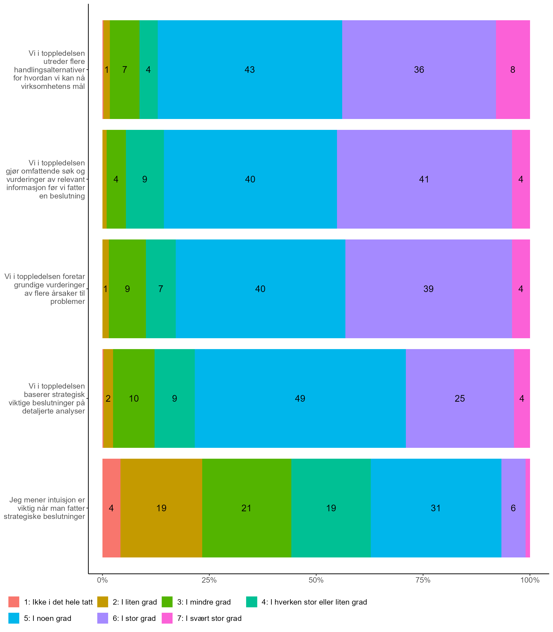 I overkant av fire av ti tilslutter seg utsagnene at toppledelsen utreder flere handlingsalternativer for hvordan de skal nå virksomhetens mål (44 prosent), at de gjør omfattende søk og vurderinger av relevant informasjon før de fatter beslutninger (45 prosent), og at de foretar grundige vurderinger av flere årsaker til eventuelle problemer (43 prosent). En noe lavere andel uttrykker at toppledelsen i stor eller svært stor grad baserer strategisk viktige beslutninger på detaljerte analyser (30 prosent). Det siste utsagnet skiller seg ut, da intuisjon ofte oppfattes som det motsatte av grundige undersøkelser og refleksjon. Figur 1 viser at 23 prosent oppgir at de ikke i det hele tatt eller i liten grad mener at intuisjon er viktig når man skal fatte strategiske beslutninger. Kun syv prosent gir uttrykk for å i stor eller svært stor grad mene dette.