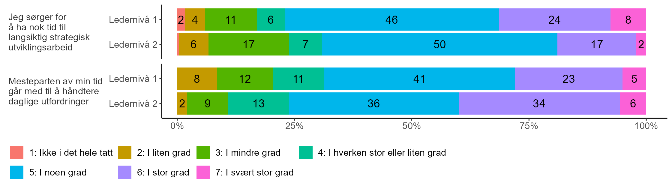 En høyere andel ledere på øverste nivå gir uttrykk for at de i stor eller svært stor grad sørger for å ha nok tid til strategisk utviklingsarbeid (32 prosent) sammenliknet med lederne på nivå 2 (19 prosent). Det er en høyere andel blant ledernivå 2 som oppgir at de i stor eller svært stor grad bruker mesteparten av tiden til å håndtere daglige utfordringer (40 prosent) enn blant de øverste lederne (29 prosent).