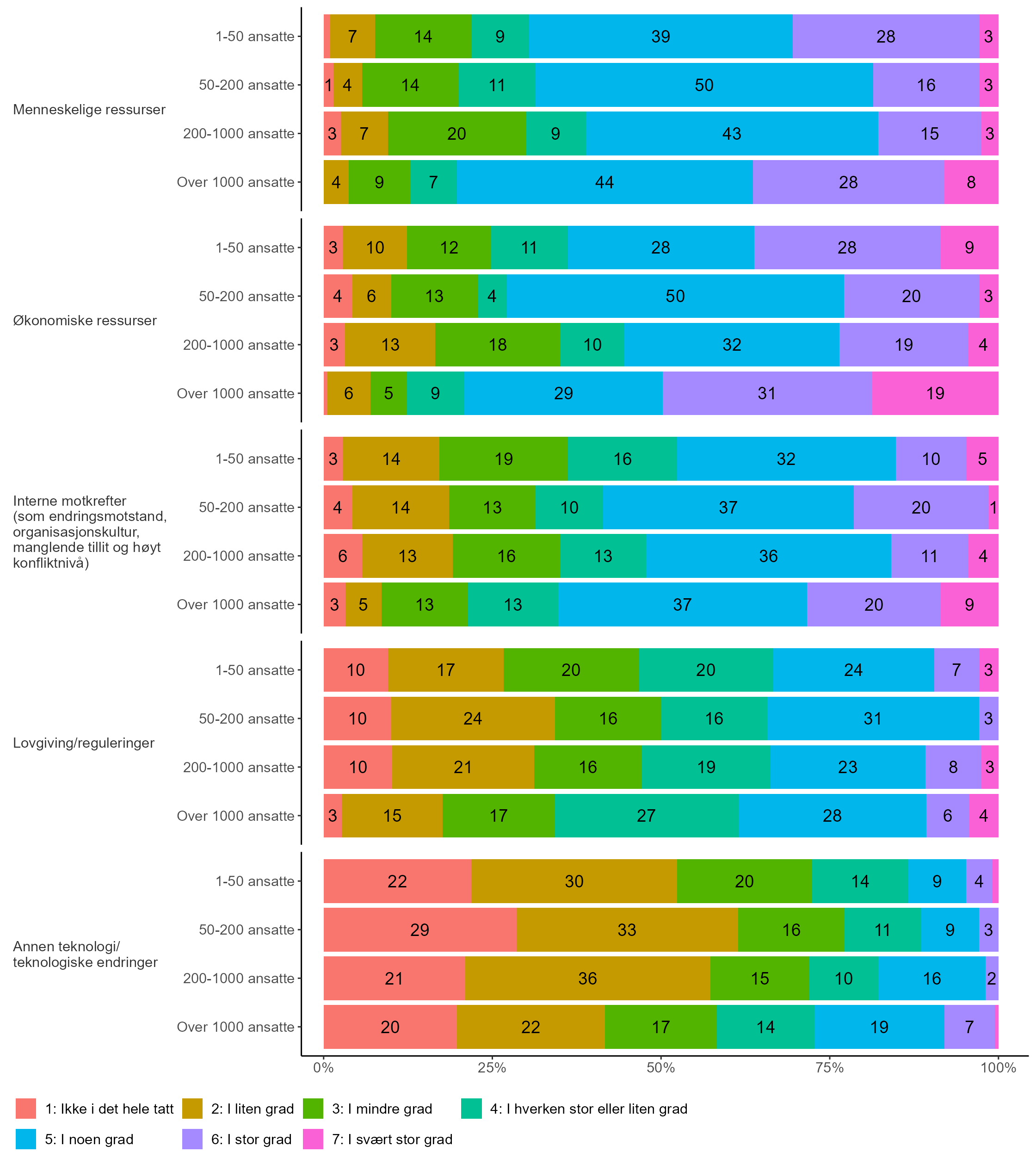 Det er høyest andel som gir uttrykk for at økonomiske (36 prosent) og menneskelige (28 prosent) ressurser i stor eller svært stor grad har hindret endringer i deres virksomhet inneværende år. Disse er etterfulgt av interne motkrefter (21 prosent) som endringsbarriere.