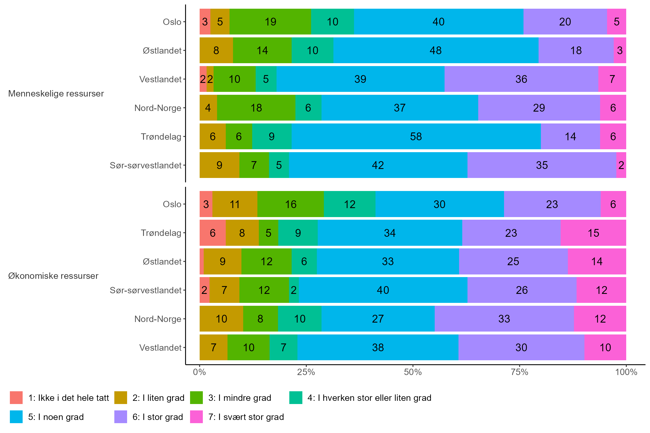 Når det gjelder både menneskelige og økonomiske ressurser som en barriere mot endring finner vi videre geografiske forskjeller. Det er høyest andel toppledere som oppgir at menneskelige ressurser utgjør en barriere mot endring på Vestlandet (43 prosent), etterfulgt av Sør-sørvestlandet (37 prosent) og Nord-Norge (35 prosent). Dette vises i figur 3: