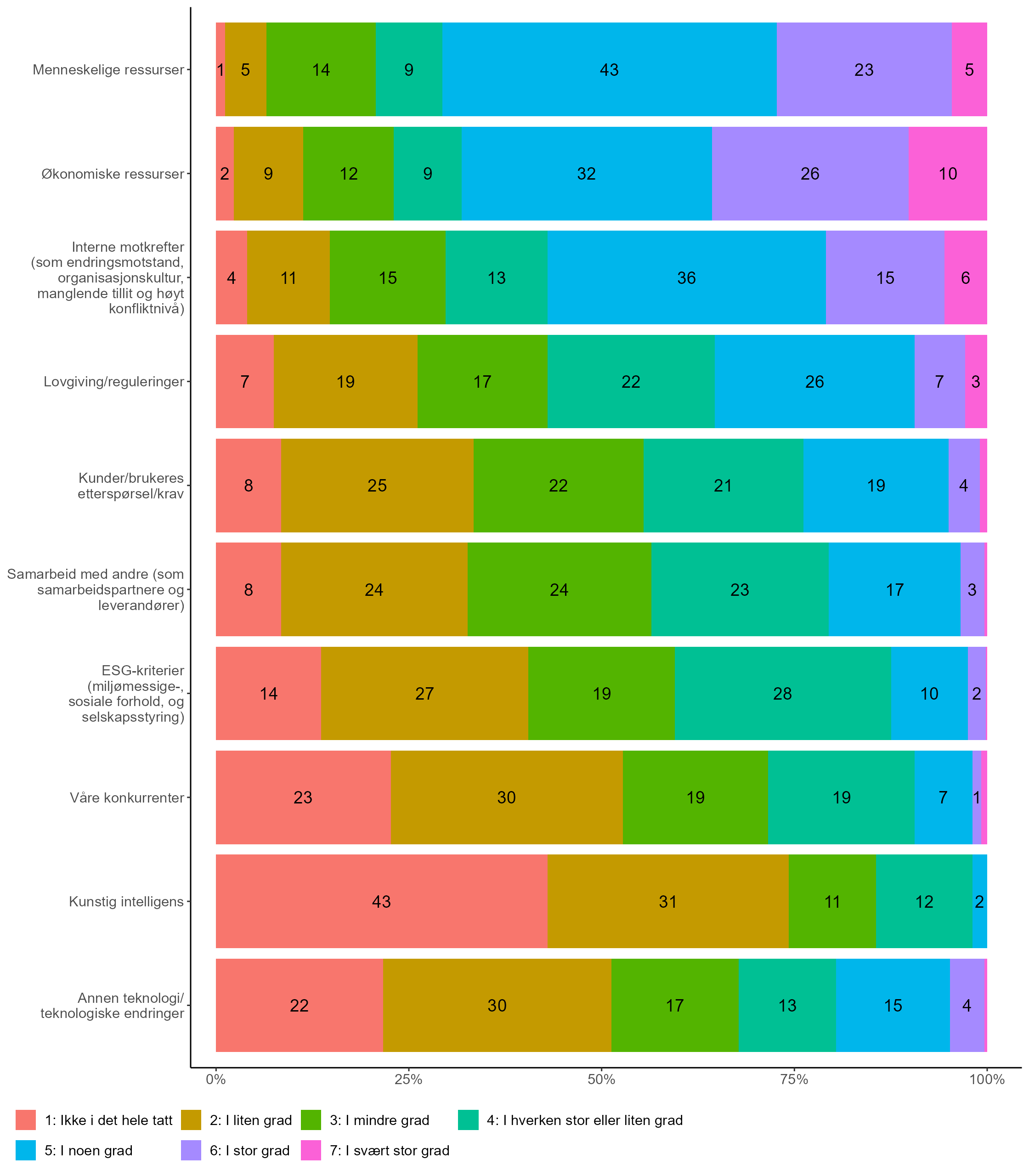 Som i fjorårets undersøkelse spurte vi også i år om hvorvidt utvalgte faktorer har utgjort barrierer mot eller hindret endring i virksomheten inneværende år. Figur 1 viser hvordan topplederne vurderer ti ulike faktorer: