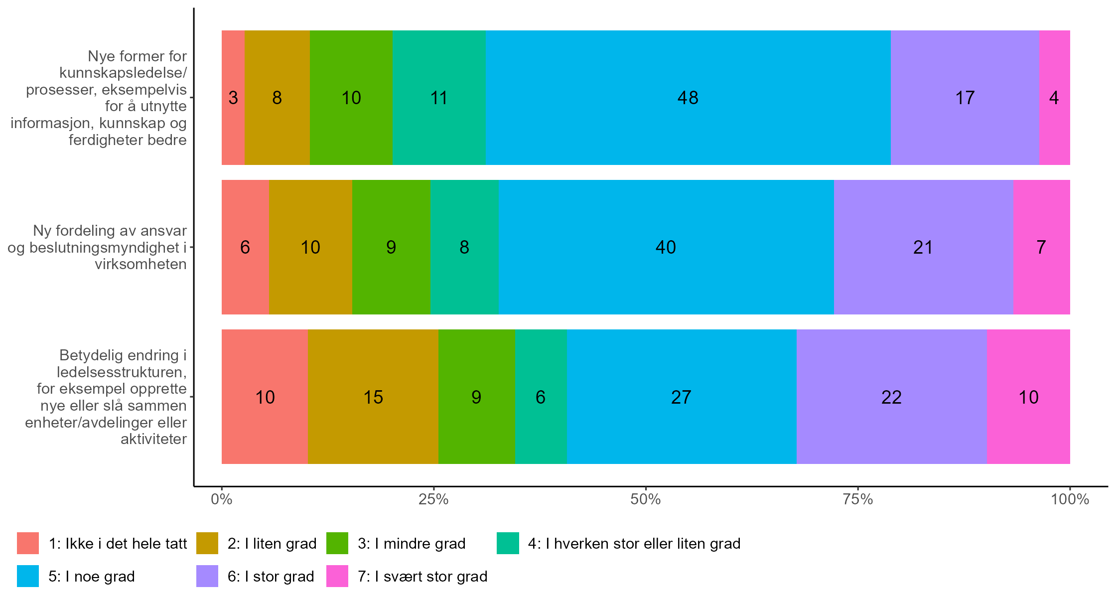Det er høyest andel som oppgir at de i stor eller svært stor grad har gjort betydelige endringer i ledelsesstrukturen, for eksempel gjennom å opprette nye eller slå sammen enheter eller avdelinger eller aktiviteter (32 prosent), etterfulgt av å ha innført ny fordeling av ansvar og beslutningsmyndighet i virksomheten (28 prosent) og nye former for kunnskapsledelse eller prosesser (21 prosent). Samtidig ser vi at det også er høyest andel som uttrykker at de ikke i det hele tatt eller i liten grad (25 prosent) har foretatt betydelige endringer i ledelsesstrukturen.