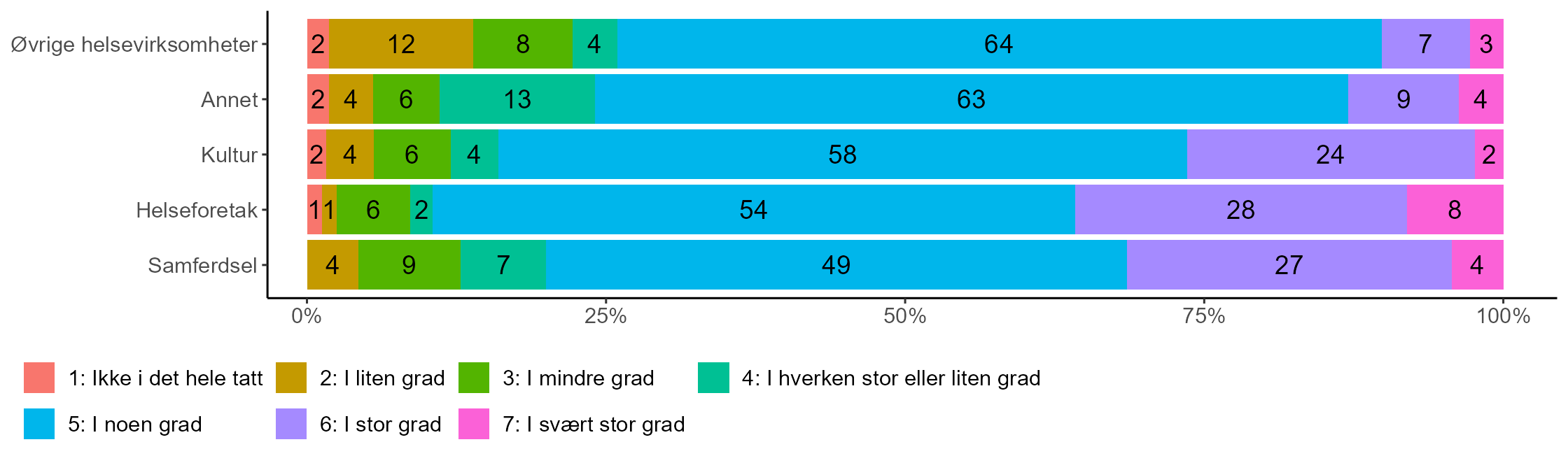 Som det fremgår av figuren er det betydelig høyere andeler innen helseforetakene (36 prosent) og i samferdselsektoren (31 prosent) som gir uttrykk for at de i dag har et udekket kompetansebehov. Andelen er lavest blant toppledere for øvrige helsevirksomheter (10 prosent) og i restkategorien “annet” (13 prosent).