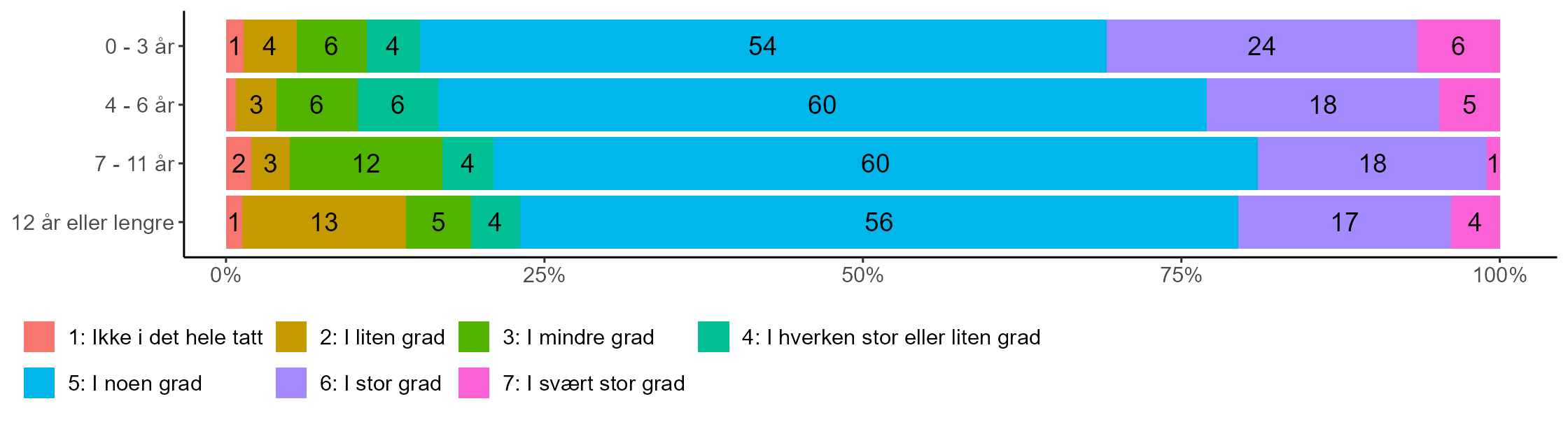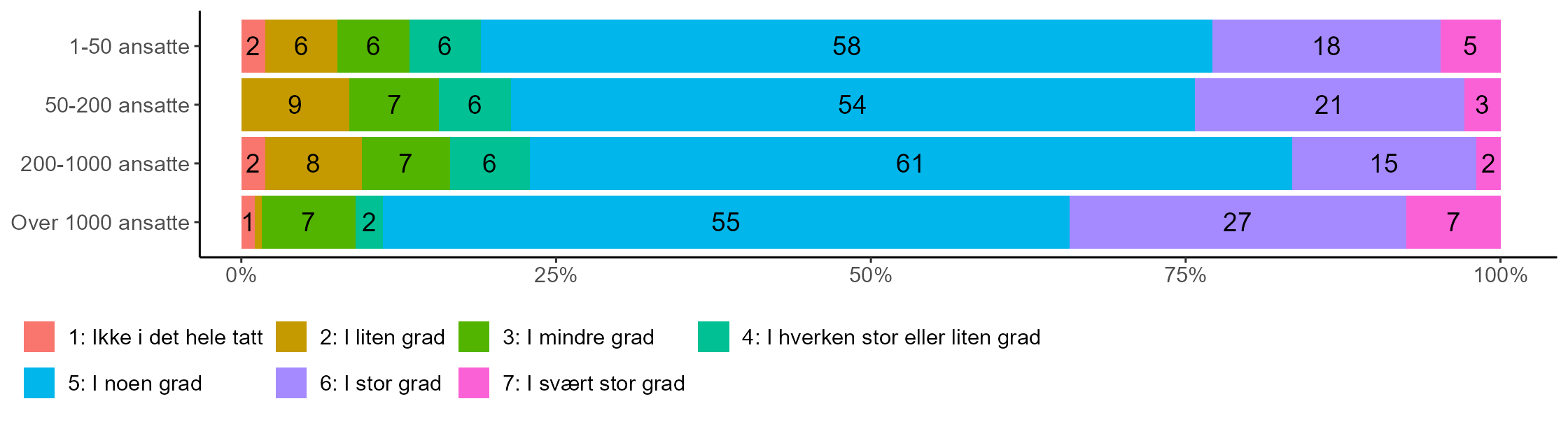 I årets undersøkelse stilte vi topplederne spørsmål om i hvilken grad virksomheten i dag har et udekket kompetansebehov i dag. På dette svarer 26 prosent at de i stor eller svært stor grad har det, mens 57 prosent oppgir at de i noen grad har slikt udekket behov. Kun én prosent gir uttrykk for at de ikke i det hele tatt har udekket kompetansebehov. Svarene på dette spørsmålet varierer blant annet med virksomhetsstørrelse, og vi ser av figur 1 at det er høyest andel blant topplederne for de største virksomhetene som svarer at de i stor eller svært stor grad har udekket kompetansebehov i dag (34 prosent):