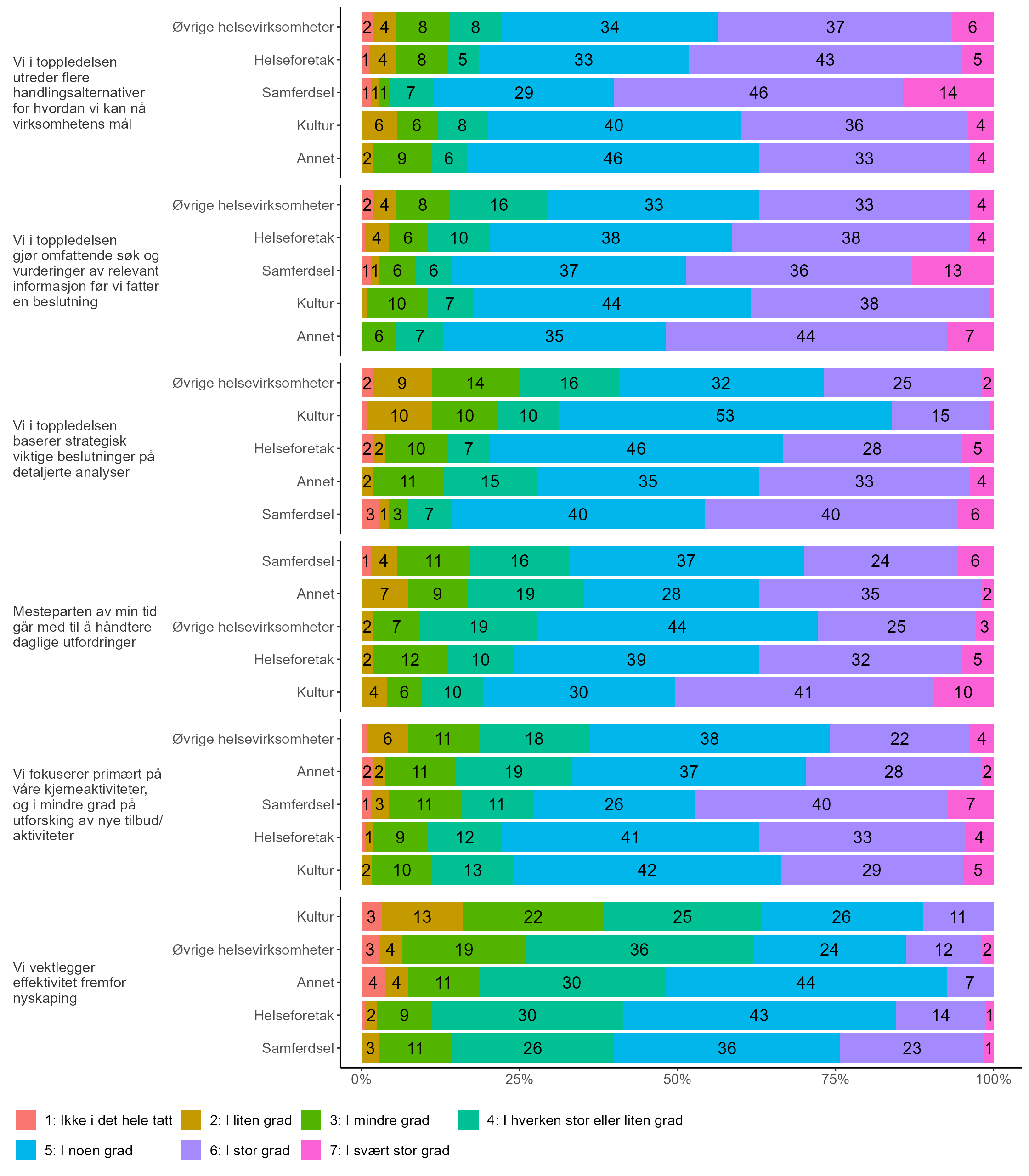 Figuren viser at det er høyest andel toppledere innen samferdselsektoren som både svarer at toppledelse i stor eller svært stor grad utreder flere handlingsalternativer for hvordan de kan nå virksomhetens mål (60 prosent), at de baserer strategisk viktige beslutninger på detaljerte analyser (46 prosent), at de primært fokuserer på kjerneaktiviteter og mindre på utforsking av nye tilbud eller aktiviteter (47 prosent) og at de vektlegger effektivitet fremfor nyskaping (24 prosent).
