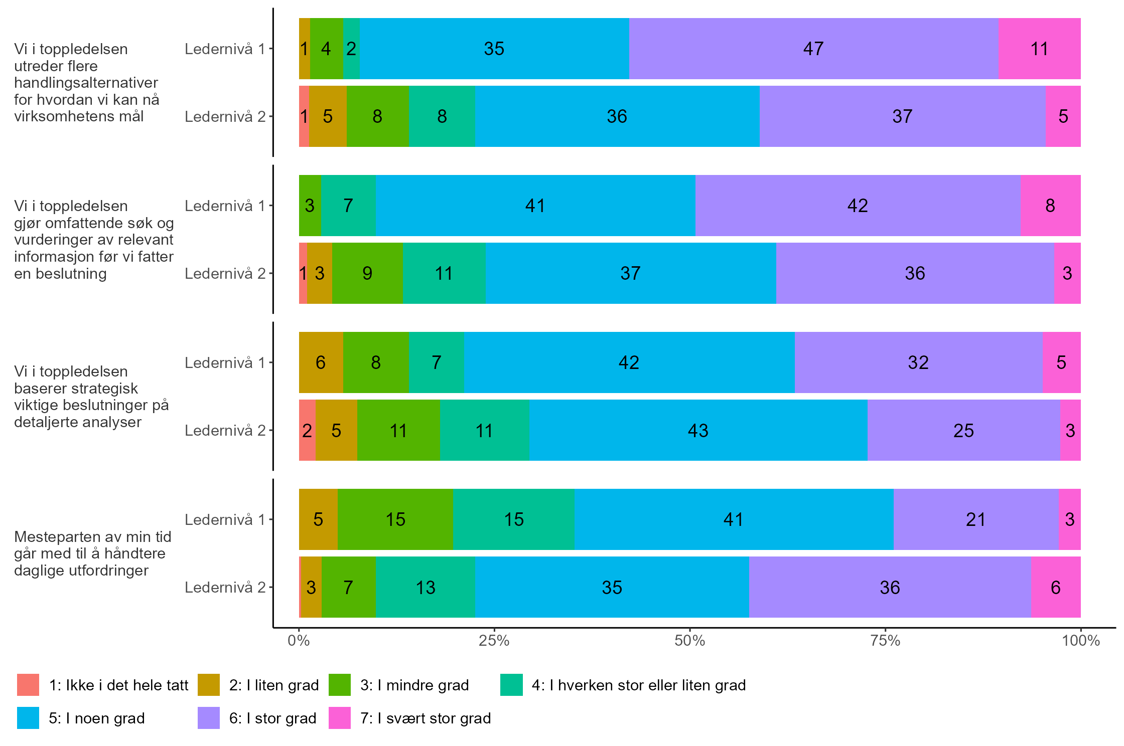Bortimot halvparten (46 prosent) av topplederne svarer at toppledelsen i stor eller svært stor grad utreder flere handlingsalternativer for hvordan de kan nå virksomhetens mål. En høy andel uttrykker det samme om å gjøre omfattende søk og vurderinger av relevant informasjon før beslutninger fattes (42 prosent). En noe lavere andel hevder at toppledelsen i stor eller svært stor grad baserer strategisk viktige beslutninger på detaljerte analyser (30 prosent)