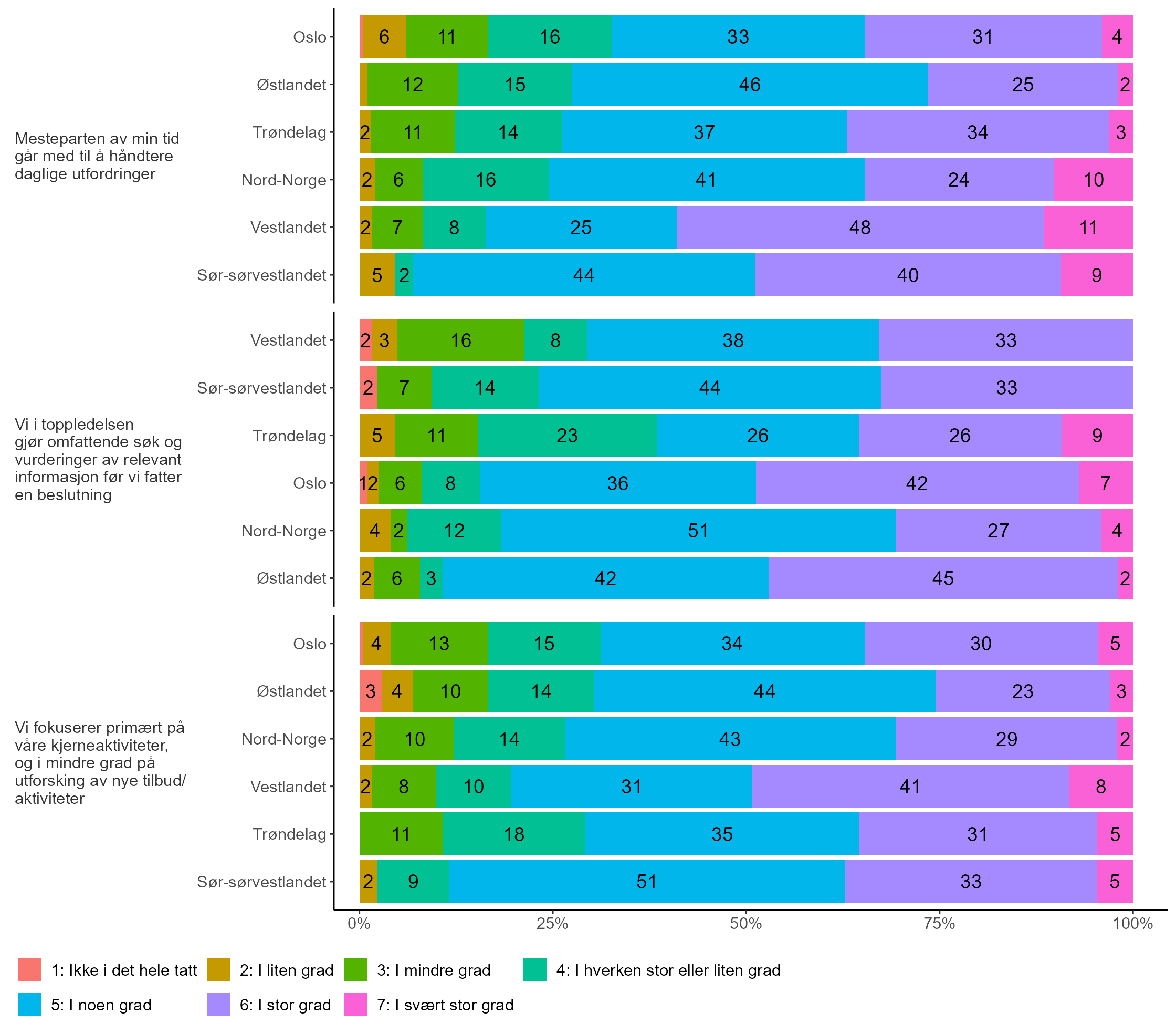 Vi ser at det er høyest andel toppledere på Vestlandet (59 prosent) og Sør-sørvestlandet (49 prosent) som gir uttrykk for at de i stor eller svært stor grad bruker mesteparten av sin tid til å håndtere daglige utfordringer. Andelen som svarer dette er lavest blant topplederne på Østlandet (27 prosent), etterfulgt av i Nord-Norge (34 prosent). Det samme mønsteret tegner seg når det gjelder å primært fokusere på kjerneaktiviteter, og mindre på innovasjon. Som vi ser svarer 49 prosent av topplederne på Vestlandet og 37 prosent på Sør-sørvestlandet at de i stor eller svært stor grad tilslutter seg dette utsagnet. Også på dette spørsmålet er andelen lavest blant topplederne på Østlandet (26 prosent), igjen etterfulgt av i Nord-Norge (31 prosent).